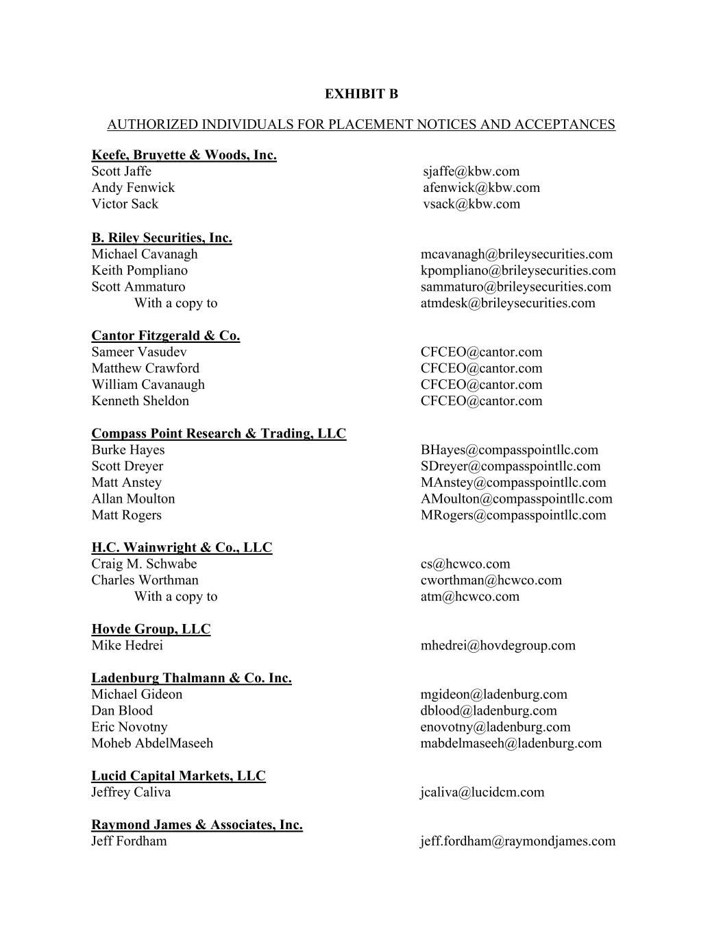 EXHIBIT B AUTHORIZED INDIVIDUALS FOR PLACEMENT NOTICES AND ACCEPTANCES Keefe, Bruyette & Woods, Inc. Scott Jaffe sjaffe@kbw.com Andy Fenwick afenwick@kbw.com Victor Sack vsack@kbw.com B. Riley Securities, Inc. Michael Cavanagh mcavanagh@brileysecurities.com Keith Pompliano kpompliano@brileysecurities.com Scott Ammaturo sammaturo@brileysecurities.com With a copy to atmdesk@brileysecurities.com Cantor Fitzgerald & Co. Sameer Vasudev CFCEO@cantor.com Matthew Crawford CFCEO@cantor.com William Cavanaugh CFCEO@cantor.com Kenneth Sheldon CFCEO@cantor.com Compass Point Research & Trading, LLC Burke Hayes BHayes@compasspointllc.com Scott Dreyer SDreyer@compasspointllc.com Matt Anstey MAnstey@compasspointllc.com Allan Moulton AMoulton@compasspointllc.com Matt Rogers MRogers@compasspointllc.com H.C. Wainwright & Co., LLC Craig M. Schwabe cs@hcwco.com Charles Worthman cworthman@hcwco.com With a copy to atm@hcwco.com Hovde Group, LLC Mike Hedrei mhedrei@hovdegroup.com Ladenburg Thalmann & Co. Inc. Michael Gideon mgideon@ladenburg.com Dan Blood dblood@ladenburg.com Eric Novotny enovotny@ladenburg.com Moheb AbdelMaseeh mabdelmaseeh@ladenburg.com Lucid Capital Markets, LLC Jeffrey Caliva jcaliva@lucidcm.com Raymond James & Associates, Inc. Jeff Fordham jeff.fordham@raymondjames.com