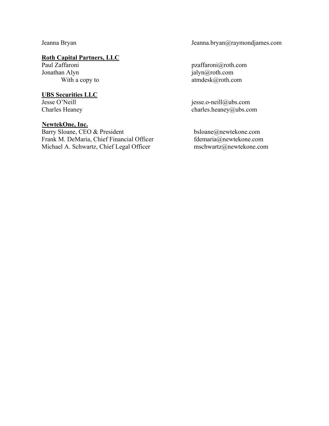 Jeanna Bryan Jeanna.bryan@raymondjames.com Roth Capital Partners, LLC Paul Zaffaroni pzaffaroni@roth.com Jonathan Alyn jalyn@roth.com With a copy to atmdesk@roth.com UBS Securities LLC Jesse O’Neill jesse.o-neill@ubs.com Charles Heaney charles.heaney@ubs.com NewtekOne, Inc. Barry Sloane, CEO & President bsloane@newtekone.com Frank M. DeMaria, Chief Financial Officer fdemaria@newtekone.com Michael A. Schwartz, Chief Legal Officer mschwartz@newtekone.com