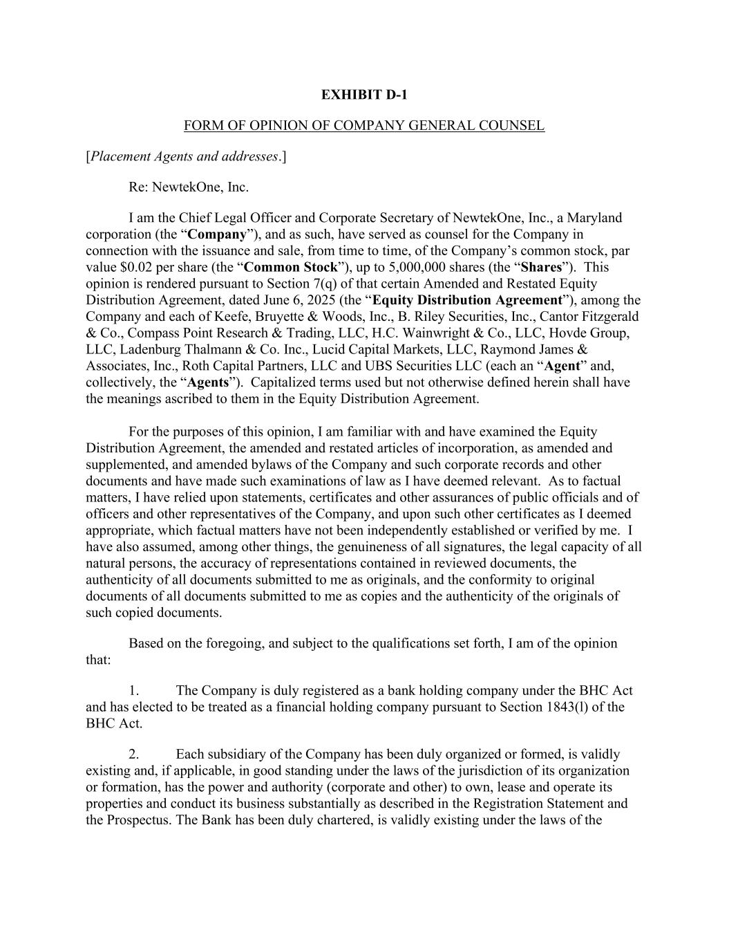 EXHIBIT D-1 FORM OF OPINION OF COMPANY GENERAL COUNSEL [Placement Agents and addresses.] Re: NewtekOne, Inc. I am the Chief Legal Officer and Corporate Secretary of NewtekOne, Inc., a Maryland corporation (the “Company”), and as such, have served as counsel for the Company in connection with the issuance and sale, from time to time, of the Company’s common stock, par value $0.02 per share (the “Common Stock”), up to 5,000,000 shares (the “Shares”). This opinion is rendered pursuant to Section 7(q) of that certain Amended and Restated Equity Distribution Agreement, dated June 6, 2025 (the “Equity Distribution Agreement”), among the Company and each of Keefe, Bruyette & Woods, Inc., B. Riley Securities, Inc., Cantor Fitzgerald & Co., Compass Point Research & Trading, LLC, H.C. Wainwright & Co., LLC, Hovde Group, LLC, Ladenburg Thalmann & Co. Inc., Lucid Capital Markets, LLC, Raymond James & Associates, Inc., Roth Capital Partners, LLC and UBS Securities LLC (each an “Agent” and, collectively, the “Agents”). Capitalized terms used but not otherwise defined herein shall have the meanings ascribed to them in the Equity Distribution Agreement. For the purposes of this opinion, I am familiar with and have examined the Equity Distribution Agreement, the amended and restated articles of incorporation, as amended and supplemented, and amended bylaws of the Company and such corporate records and other documents and have made such examinations of law as I have deemed relevant. As to factual matters, I have relied upon statements, certificates and other assurances of public officials and of officers and other representatives of the Company, and upon such other certificates as I deemed appropriate, which factual matters have not been independently established or verified by me. I have also assumed, among other things, the genuineness of all signatures, the legal capacity of all natural persons, the accuracy of representations contained in reviewed documents, the authenticity of all documents submitted to me as originals, and the conformity to original documents of all documents submitted to me as copies and the authenticity of the originals of such copied documents. Based on the foregoing, and subject to the qualifications set forth, I am of the opinion that: 1. The Company is duly registered as a bank holding company under the BHC Act and has elected to be treated as a financial holding company pursuant to Section 1843(l) of the BHC Act. 2. Each subsidiary of the Company has been duly organized or formed, is validly existing and, if applicable, in good standing under the laws of the jurisdiction of its organization or formation, has the power and authority (corporate and other) to own, lease and operate its properties and conduct its business substantially as described in the Registration Statement and the Prospectus. The Bank has been duly chartered, is validly existing under the laws of the
