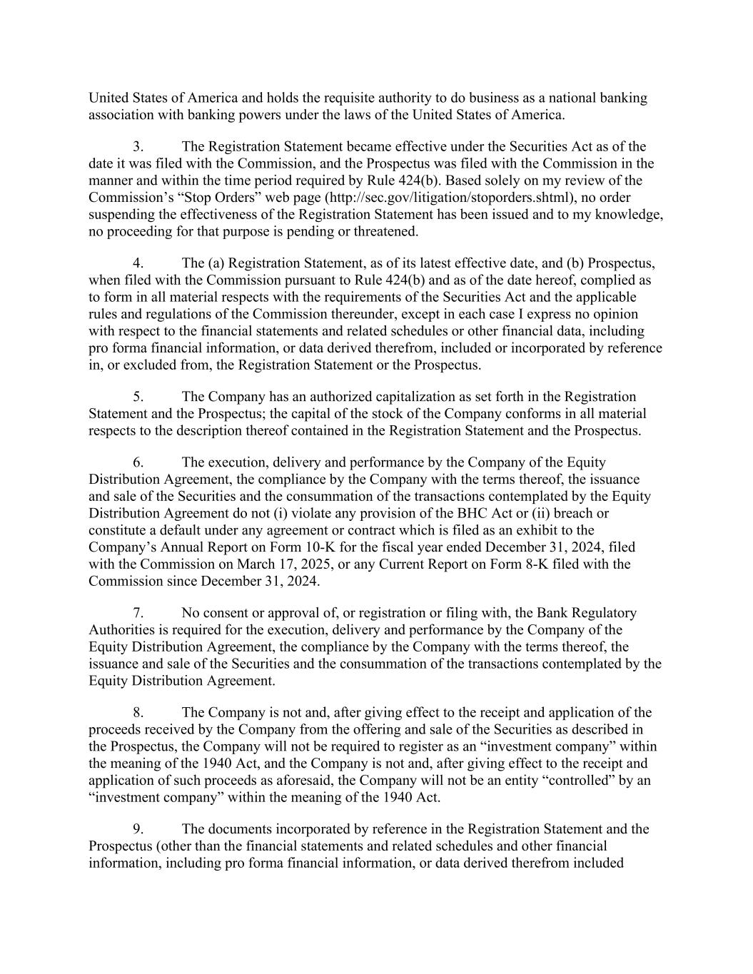 United States of America and holds the requisite authority to do business as a national banking association with banking powers under the laws of the United States of America. 3. The Registration Statement became effective under the Securities Act as of the date it was filed with the Commission, and the Prospectus was filed with the Commission in the manner and within the time period required by Rule 424(b). Based solely on my review of the Commission’s “Stop Orders” web page (http://sec.gov/litigation/stoporders.shtml), no order suspending the effectiveness of the Registration Statement has been issued and to my knowledge, no proceeding for that purpose is pending or threatened. 4. The (a) Registration Statement, as of its latest effective date, and (b) Prospectus, when filed with the Commission pursuant to Rule 424(b) and as of the date hereof, complied as to form in all material respects with the requirements of the Securities Act and the applicable rules and regulations of the Commission thereunder, except in each case I express no opinion with respect to the financial statements and related schedules or other financial data, including pro forma financial information, or data derived therefrom, included or incorporated by reference in, or excluded from, the Registration Statement or the Prospectus. 5. The Company has an authorized capitalization as set forth in the Registration Statement and the Prospectus; the capital of the stock of the Company conforms in all material respects to the description thereof contained in the Registration Statement and the Prospectus. 6. The execution, delivery and performance by the Company of the Equity Distribution Agreement, the compliance by the Company with the terms thereof, the issuance and sale of the Securities and the consummation of the transactions contemplated by the Equity Distribution Agreement do not (i) violate any provision of the BHC Act or (ii) breach or constitute a default under any agreement or contract which is filed as an exhibit to the Company’s Annual Report on Form 10-K for the fiscal year ended December 31, 2024, filed with the Commission on March 17, 2025, or any Current Report on Form 8-K filed with the Commission since December 31, 2024. 7. No consent or approval of, or registration or filing with, the Bank Regulatory Authorities is required for the execution, delivery and performance by the Company of the Equity Distribution Agreement, the compliance by the Company with the terms thereof, the issuance and sale of the Securities and the consummation of the transactions contemplated by the Equity Distribution Agreement. 8. The Company is not and, after giving effect to the receipt and application of the proceeds received by the Company from the offering and sale of the Securities as described in the Prospectus, the Company will not be required to register as an “investment company” within the meaning of the 1940 Act, and the Company is not and, after giving effect to the receipt and application of such proceeds as aforesaid, the Company will not be an entity “controlled” by an “investment company” within the meaning of the 1940 Act. 9. The documents incorporated by reference in the Registration Statement and the Prospectus (other than the financial statements and related schedules and other financial information, including pro forma financial information, or data derived therefrom included