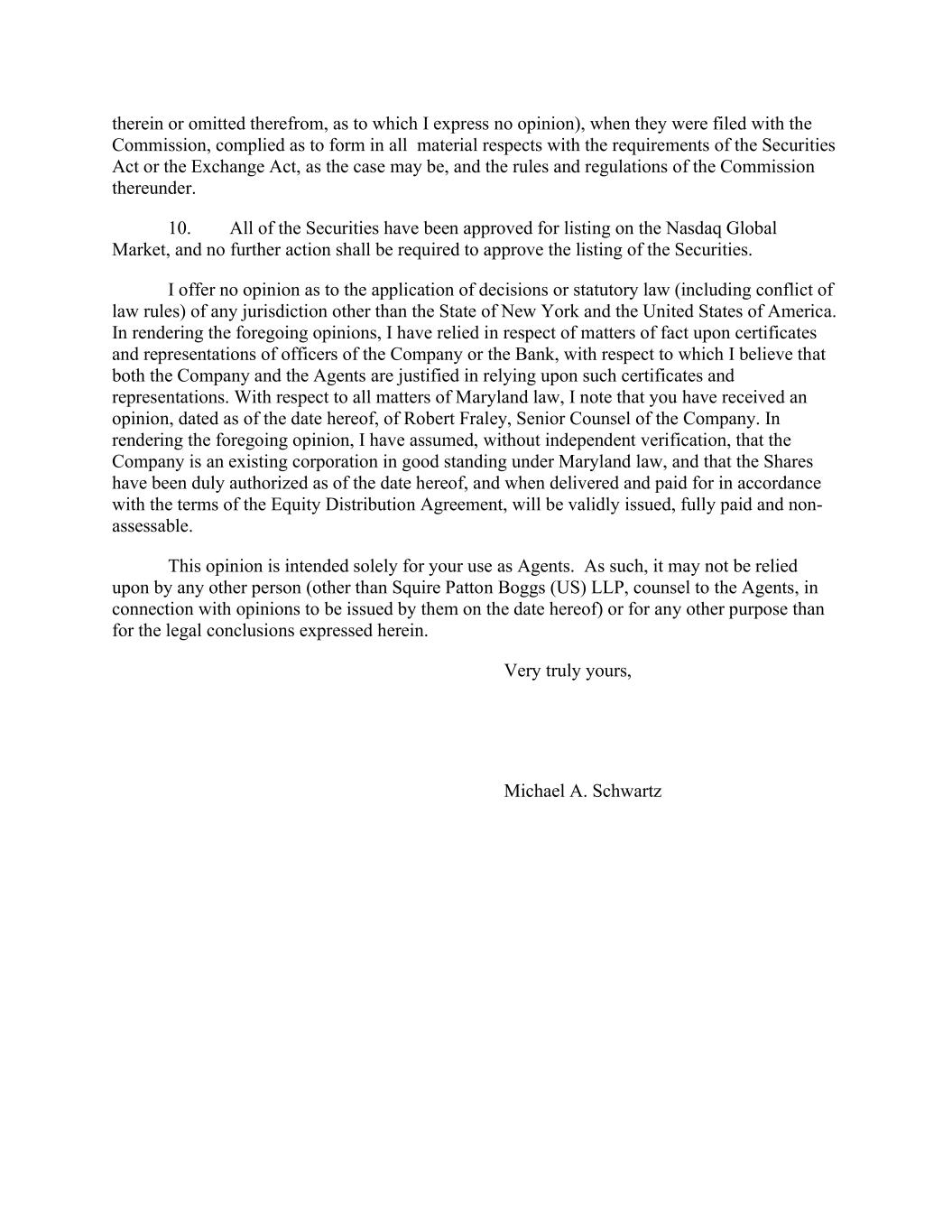 therein or omitted therefrom, as to which I express no opinion), when they were filed with the Commission, complied as to form in all material respects with the requirements of the Securities Act or the Exchange Act, as the case may be, and the rules and regulations of the Commission thereunder. 10. All of the Securities have been approved for listing on the Nasdaq Global Market, and no further action shall be required to approve the listing of the Securities. I offer no opinion as to the application of decisions or statutory law (including conflict of law rules) of any jurisdiction other than the State of New York and the United States of America. In rendering the foregoing opinions, I have relied in respect of matters of fact upon certificates and representations of officers of the Company or the Bank, with respect to which I believe that both the Company and the Agents are justified in relying upon such certificates and representations. With respect to all matters of Maryland law, I note that you have received an opinion, dated as of the date hereof, of Robert Fraley, Senior Counsel of the Company. In rendering the foregoing opinion, I have assumed, without independent verification, that the Company is an existing corporation in good standing under Maryland law, and that the Shares have been duly authorized as of the date hereof, and when delivered and paid for in accordance with the terms of the Equity Distribution Agreement, will be validly issued, fully paid and non- assessable. This opinion is intended solely for your use as Agents. As such, it may not be relied upon by any other person (other than Squire Patton Boggs (US) LLP, counsel to the Agents, in connection with opinions to be issued by them on the date hereof) or for any other purpose than for the legal conclusions expressed herein. Very truly yours, Michael A. Schwartz