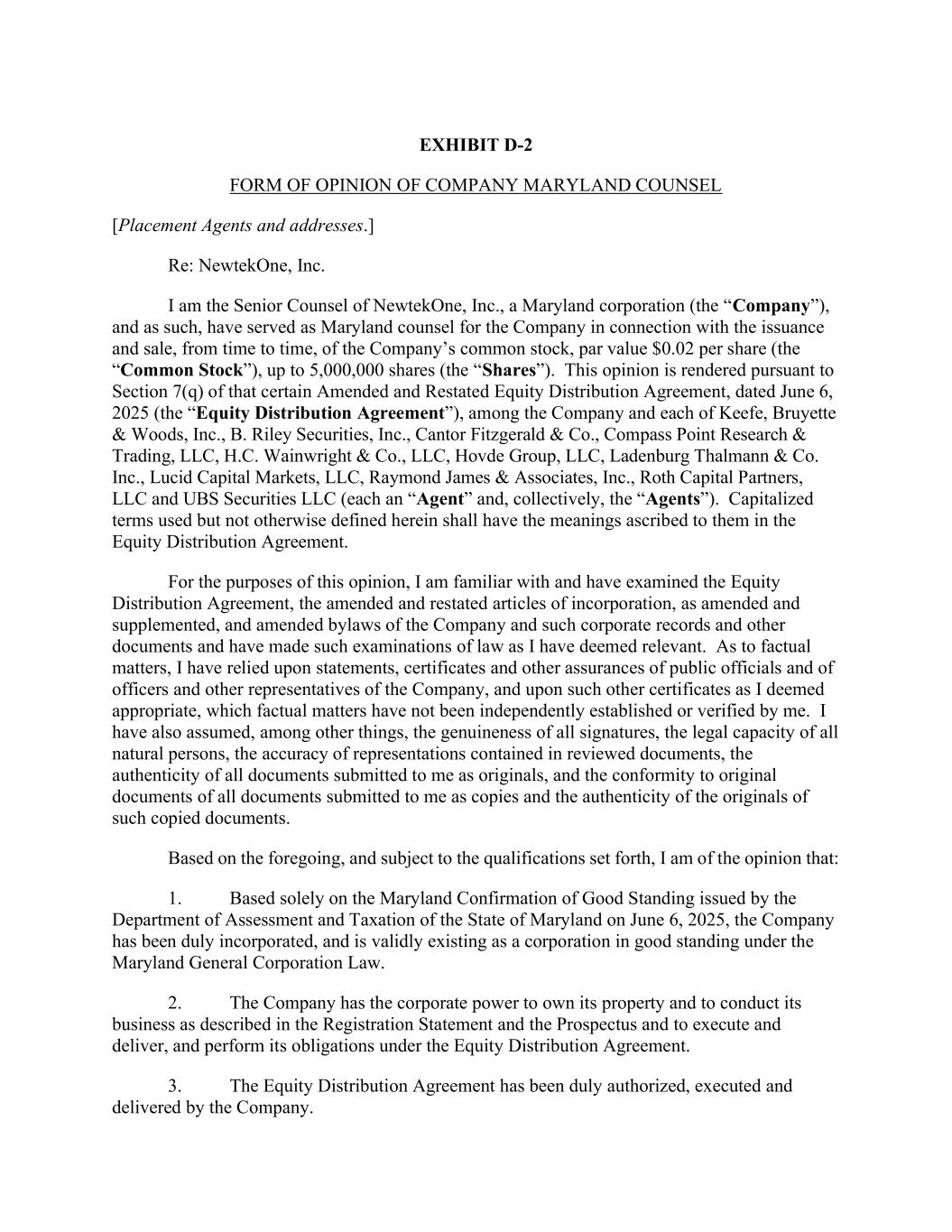 EXHIBIT D-2 FORM OF OPINION OF COMPANY MARYLAND COUNSEL [Placement Agents and addresses.] Re: NewtekOne, Inc. I am the Senior Counsel of NewtekOne, Inc., a Maryland corporation (the “Company”), and as such, have served as Maryland counsel for the Company in connection with the issuance and sale, from time to time, of the Company’s common stock, par value $0.02 per share (the “Common Stock”), up to 5,000,000 shares (the “Shares”). This opinion is rendered pursuant to Section 7(q) of that certain Amended and Restated Equity Distribution Agreement, dated June 6, 2025 (the “Equity Distribution Agreement”), among the Company and each of Keefe, Bruyette & Woods, Inc., B. Riley Securities, Inc., Cantor Fitzgerald & Co., Compass Point Research & Trading, LLC, H.C. Wainwright & Co., LLC, Hovde Group, LLC, Ladenburg Thalmann & Co. Inc., Lucid Capital Markets, LLC, Raymond James & Associates, Inc., Roth Capital Partners, LLC and UBS Securities LLC (each an “Agent” and, collectively, the “Agents”). Capitalized terms used but not otherwise defined herein shall have the meanings ascribed to them in the Equity Distribution Agreement. For the purposes of this opinion, I am familiar with and have examined the Equity Distribution Agreement, the amended and restated articles of incorporation, as amended and supplemented, and amended bylaws of the Company and such corporate records and other documents and have made such examinations of law as I have deemed relevant. As to factual matters, I have relied upon statements, certificates and other assurances of public officials and of officers and other representatives of the Company, and upon such other certificates as I deemed appropriate, which factual matters have not been independently established or verified by me. I have also assumed, among other things, the genuineness of all signatures, the legal capacity of all natural persons, the accuracy of representations contained in reviewed documents, the authenticity of all documents submitted to me as originals, and the conformity to original documents of all documents submitted to me as copies and the authenticity of the originals of such copied documents. Based on the foregoing, and subject to the qualifications set forth, I am of the opinion that: 1. Based solely on the Maryland Confirmation of Good Standing issued by the Department of Assessment and Taxation of the State of Maryland on June 6, 2025, the Company has been duly incorporated, and is validly existing as a corporation in good standing under the Maryland General Corporation Law. 2. The Company has the corporate power to own its property and to conduct its business as described in the Registration Statement and the Prospectus and to execute and deliver, and perform its obligations under the Equity Distribution Agreement. 3. The Equity Distribution Agreement has been duly authorized, executed and delivered by the Company.
