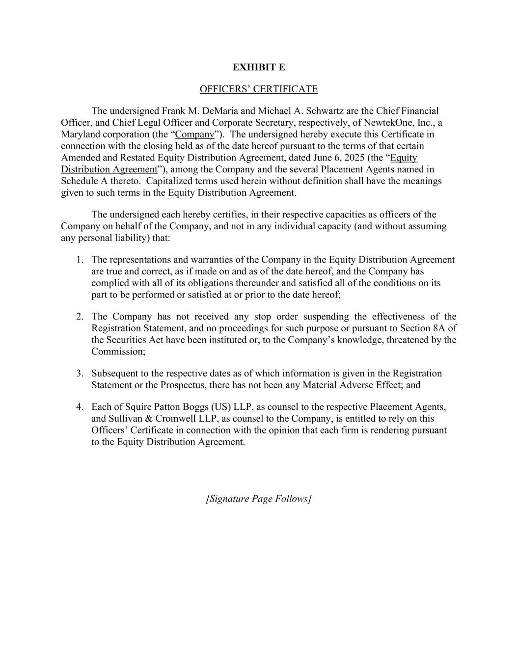EXHIBIT E OFFICERS’ CERTIFICATE The undersigned Frank M. DeMaria and Michael A. Schwartz are the Chief Financial Officer, and Chief Legal Officer and Corporate Secretary, respectively, of NewtekOne, Inc., a Maryland corporation (the “Company”). The undersigned hereby execute this Certificate in connection with the closing held as of the date hereof pursuant to the terms of that certain Amended and Restated Equity Distribution Agreement, dated June 6, 2025 (the “Equity Distribution Agreement”), among the Company and the several Placement Agents named in Schedule A thereto. Capitalized terms used herein without definition shall have the meanings given to such terms in the Equity Distribution Agreement. The undersigned each hereby certifies, in their respective capacities as officers of the Company on behalf of the Company, and not in any individual capacity (and without assuming any personal liability) that: 1. The representations and warranties of the Company in the Equity Distribution Agreement are true and correct, as if made on and as of the date hereof, and the Company has complied with all of its obligations thereunder and satisfied all of the conditions on its part to be performed or satisfied at or prior to the date hereof; 2. The Company has not received any stop order suspending the effectiveness of the Registration Statement, and no proceedings for such purpose or pursuant to Section 8A of the Securities Act have been instituted or, to the Company’s knowledge, threatened by the Commission; 3. Subsequent to the respective dates as of which information is given in the Registration Statement or the Prospectus, there has not been any Material Adverse Effect; and 4. Each of Squire Patton Boggs (US) LLP, as counsel to the respective Placement Agents, and Sullivan & Cromwell LLP, as counsel to the Company, is entitled to rely on this Officers’ Certificate in connection with the opinion that each firm is rendering pursuant to the Equity Distribution Agreement. [Signature Page Follows]