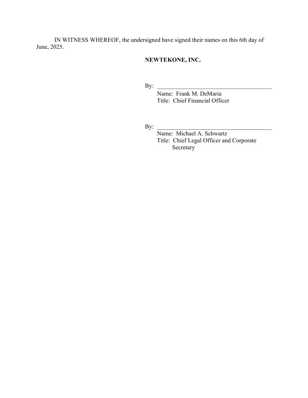 IN WITNESS WHEREOF, the undersigned have signed their names on this 6th day of June, 2025. NEWTEKONE, INC. By: ______________________________________ Name: Frank M. DeMaria Title: Chief Financial Officer By: ______________________________________ Name: Michael A. Schwartz Title: Chief Legal Officer and Corporate Secretary