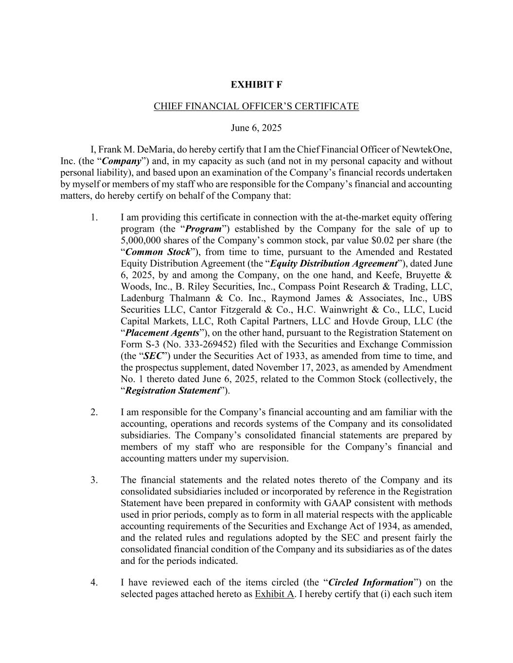 EXHIBIT F CHIEF FINANCIAL OFFICER’S CERTIFICATE June 6, 2025 I, Frank M. DeMaria, do hereby certify that I am the Chief Financial Officer of NewtekOne, Inc. (the “Company”) and, in my capacity as such (and not in my personal capacity and without personal liability), and based upon an examination of the Company’s financial records undertaken by myself or members of my staff who are responsible for the Company’s financial and accounting matters, do hereby certify on behalf of the Company that: 1. I am providing this certificate in connection with the at-the-market equity offering program (the “Program”) established by the Company for the sale of up to 5,000,000 shares of the Company’s common stock, par value $0.02 per share (the “Common Stock”), from time to time, pursuant to the Amended and Restated Equity Distribution Agreement (the “Equity Distribution Agreement”), dated June 6, 2025, by and among the Company, on the one hand, and Keefe, Bruyette & Woods, Inc., B. Riley Securities, Inc., Compass Point Research & Trading, LLC, Ladenburg Thalmann & Co. Inc., Raymond James & Associates, Inc., UBS Securities LLC, Cantor Fitzgerald & Co., H.C. Wainwright & Co., LLC, Lucid Capital Markets, LLC, Roth Capital Partners, LLC and Hovde Group, LLC (the “Placement Agents”), on the other hand, pursuant to the Registration Statement on Form S-3 (No. 333-269452) filed with the Securities and Exchange Commission (the “SEC”) under the Securities Act of 1933, as amended from time to time, and the prospectus supplement, dated November 17, 2023, as amended by Amendment No. 1 thereto dated June 6, 2025, related to the Common Stock (collectively, the “Registration Statement”). 2. I am responsible for the Company’s financial accounting and am familiar with the accounting, operations and records systems of the Company and its consolidated subsidiaries. The Company’s consolidated financial statements are prepared by members of my staff who are responsible for the Company’s financial and accounting matters under my supervision. 3. The financial statements and the related notes thereto of the Company and its consolidated subsidiaries included or incorporated by reference in the Registration Statement have been prepared in conformity with GAAP consistent with methods used in prior periods, comply as to form in all material respects with the applicable accounting requirements of the Securities and Exchange Act of 1934, as amended, and the related rules and regulations adopted by the SEC and present fairly the consolidated financial condition of the Company and its subsidiaries as of the dates and for the periods indicated. 4. I have reviewed each of the items circled (the “Circled Information”) on the selected pages attached hereto as Exhibit A. I hereby certify that (i) each such item