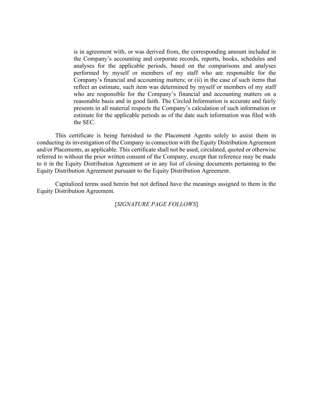 is in agreement with, or was derived from, the corresponding amount included in the Company’s accounting and corporate records, reports, books, schedules and analyses for the applicable periods, based on the comparisons and analyses performed by myself or members of my staff who are responsible for the Company’s financial and accounting matters; or (ii) in the case of such items that reflect an estimate, such item was determined by myself or members of my staff who are responsible for the Company’s financial and accounting matters on a reasonable basis and in good faith. The Circled Information is accurate and fairly presents in all material respects the Company’s calculation of such information or estimate for the applicable periods as of the date such information was filed with the SEC. This certificate is being furnished to the Placement Agents solely to assist them in conducting its investigation of the Company in connection with the Equity Distribution Agreement and/or Placements, as applicable. This certificate shall not be used, circulated, quoted or otherwise referred to without the prior written consent of the Company, except that reference may be made to it in the Equity Distribution Agreement or in any list of closing documents pertaining to the Equity Distribution Agreement pursuant to the Equity Distribution Agreement. Capitalized terms used herein but not defined have the meanings assigned to them in the Equity Distribution Agreement. [SIGNATURE PAGE FOLLOWS]