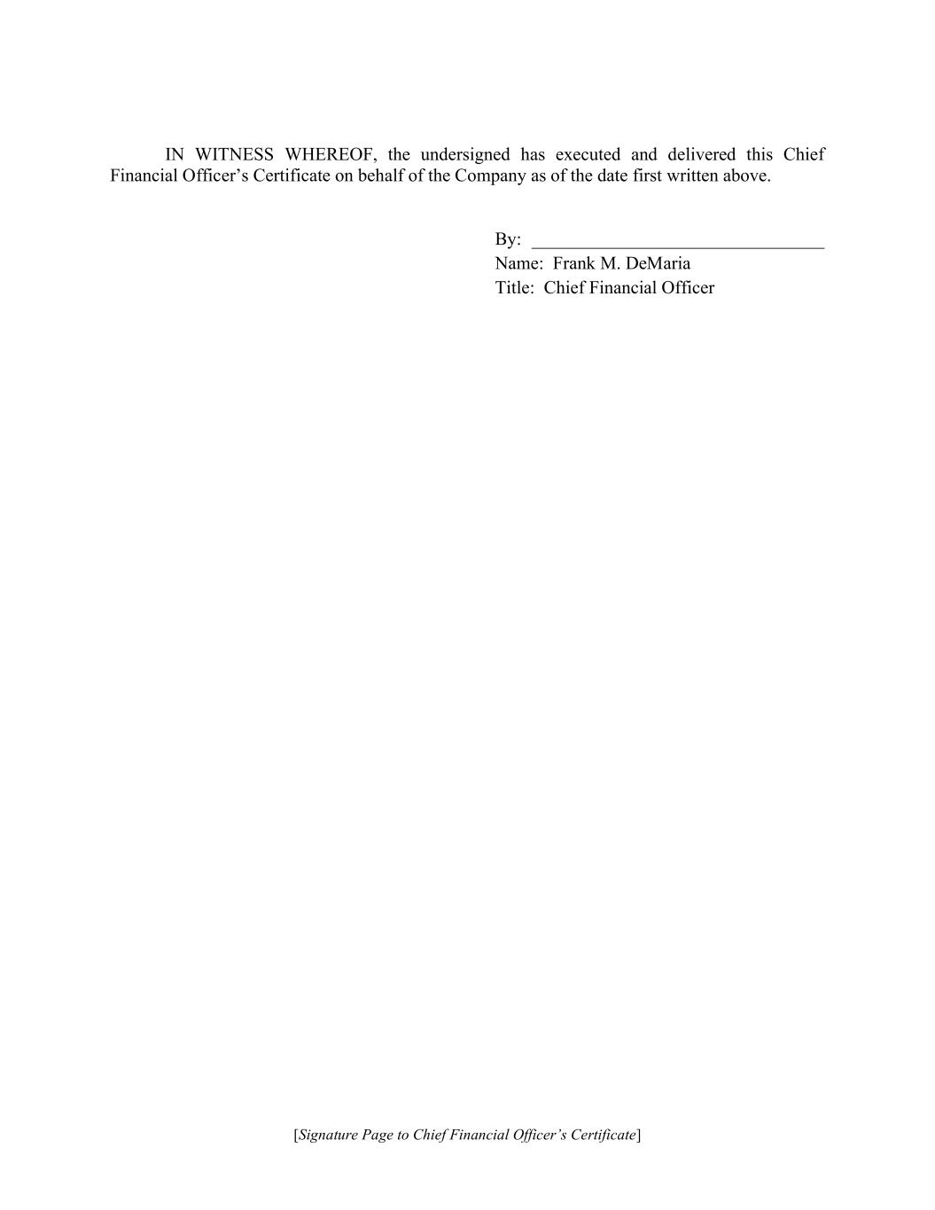 [Signature Page to Chief Financial Officer’s Certificate] IN WITNESS WHEREOF, the undersigned has executed and delivered this Chief Financial Officer’s Certificate on behalf of the Company as of the date first written above. By: ________________________________ Name: Frank M. DeMaria Title: Chief Financial Officer