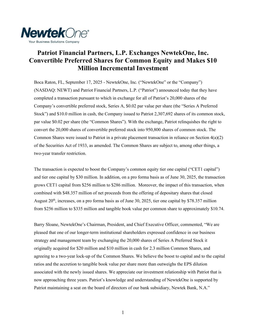 1 Patriot Financial Partners, L.P. Exchanges NewtekOne, Inc. Convertible Preferred Shares for Common Equity and Makes $10 Million Incremental Investment Boca Raton, FL, September 17, 2025 - NewtekOne, Inc. (“NewtekOne” or the “Company”) (NASDAQ: NEWT) and Patriot Financial Partners, L.P. (“Patriot”) announced today that they have completed a transaction pursuant to which in exchange for all of Patriot’s 20,000 shares of the Company’s convertible preferred stock, Series A, $0.02 par value per share (the “Series A Preferred Stock”) and $10.0 million in cash, the Company issued to Patriot 2,307,692 shares of its common stock, par value $0.02 per share (the “Common Shares”). With the exchange, Patriot relinquishes the right to convert the 20,000 shares of convertible preferred stock into 950,800 shares of common stock. The Common Shares were issued to Patriot in a private placement transaction in reliance on Section 4(a)(2) of the Securities Act of 1933, as amended. The Common Shares are subject to, among other things, a two-year transfer restriction. The transaction is expected to boost the Company’s common equity tier one capital (“CET1 capital”) and tier one capital by $30 million. In addition, on a pro forma basis as of June 30, 2025, the transaction grows CET1 capital from $256 million to $286 million. Moreover, the impact of this transaction, when combined with $48.357 million of net proceeds from the offering of depositary shares that closed August 20th, increases, on a pro forma basis as of June 30, 2025, tier one capital by $78.357 million from $256 million to $335 million and tangible book value per common share to approximately $10.74. Barry Sloane, NewtekOne’s Chairman, President, and Chief Executive Officer, commented, “We are pleased that one of our longer-term institutional shareholders expressed confidence in our business strategy and management team by exchanging the 20,000 shares of Series A Preferred Stock it originally acquired for $20 million and $10 million in cash for 2.3 million Common Shares, and agreeing to a two-year lock-up of the Common Shares. We believe the boost to capital and to the capital ratios and the accretion to tangible book value per share more than outweighs the EPS dilution associated with the newly issued shares. We appreciate our investment relationship with Patriot that is now approaching three years. Patriot’s knowledge and understanding of NewtekOne is supported by Patriot maintaining a seat on the board of directors of our bank subsidiary, Newtek Bank, N.A.”