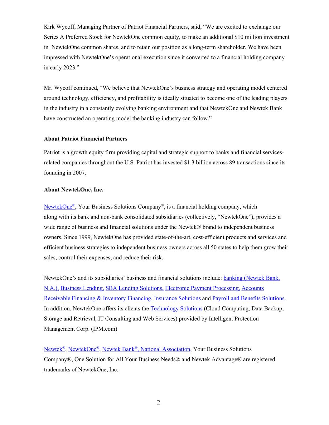 2 Kirk Wycoff, Managing Partner of Patriot Financial Partners, said, “We are excited to exchange our Series A Preferred Stock for NewtekOne common equity, to make an additional $10 million investment in NewtekOne common shares, and to retain our position as a long-term shareholder. We have been impressed with NewtekOne’s operational execution since it converted to a financial holding company in early 2023.” Mr. Wycoff continued, “We believe that NewtekOne’s business strategy and operating model centered around technology, efficiency, and profitability is ideally situated to become one of the leading players in the industry in a constantly evolving banking environment and that NewtekOne and Newtek Bank have constructed an operating model the banking industry can follow.” About Patriot Financial Partners Patriot is a growth equity firm providing capital and strategic support to banks and financial services- related companies throughout the U.S. Patriot has invested $1.3 billion across 89 transactions since its founding in 2007. About NewtekOne, Inc. NewtekOne®, Your Business Solutions Company®, is a financial holding company, which along with its bank and non-bank consolidated subsidiaries (collectively, “NewtekOne”), provides a wide range of business and financial solutions under the Newtek® brand to independent business owners. Since 1999, NewtekOne has provided state-of-the-art, cost-efficient products and services and efficient business strategies to independent business owners across all 50 states to help them grow their sales, control their expenses, and reduce their risk. NewtekOne’s and its subsidiaries’ business and financial solutions include: banking (Newtek Bank, N.A.), Business Lending, SBA Lending Solutions, Electronic Payment Processing, Accounts Receivable Financing & Inventory Financing, Insurance Solutions and Payroll and Benefits Solutions. In addition, NewtekOne offers its clients the Technology Solutions (Cloud Computing, Data Backup, Storage and Retrieval, IT Consulting and Web Services) provided by Intelligent Protection Management Corp. (IPM.com) Newtek®, NewtekOne®, Newtek Bank®, National Association, Your Business Solutions Company®, One Solution for All Your Business Needs® and Newtek Advantage® are registered trademarks of NewtekOne, Inc.