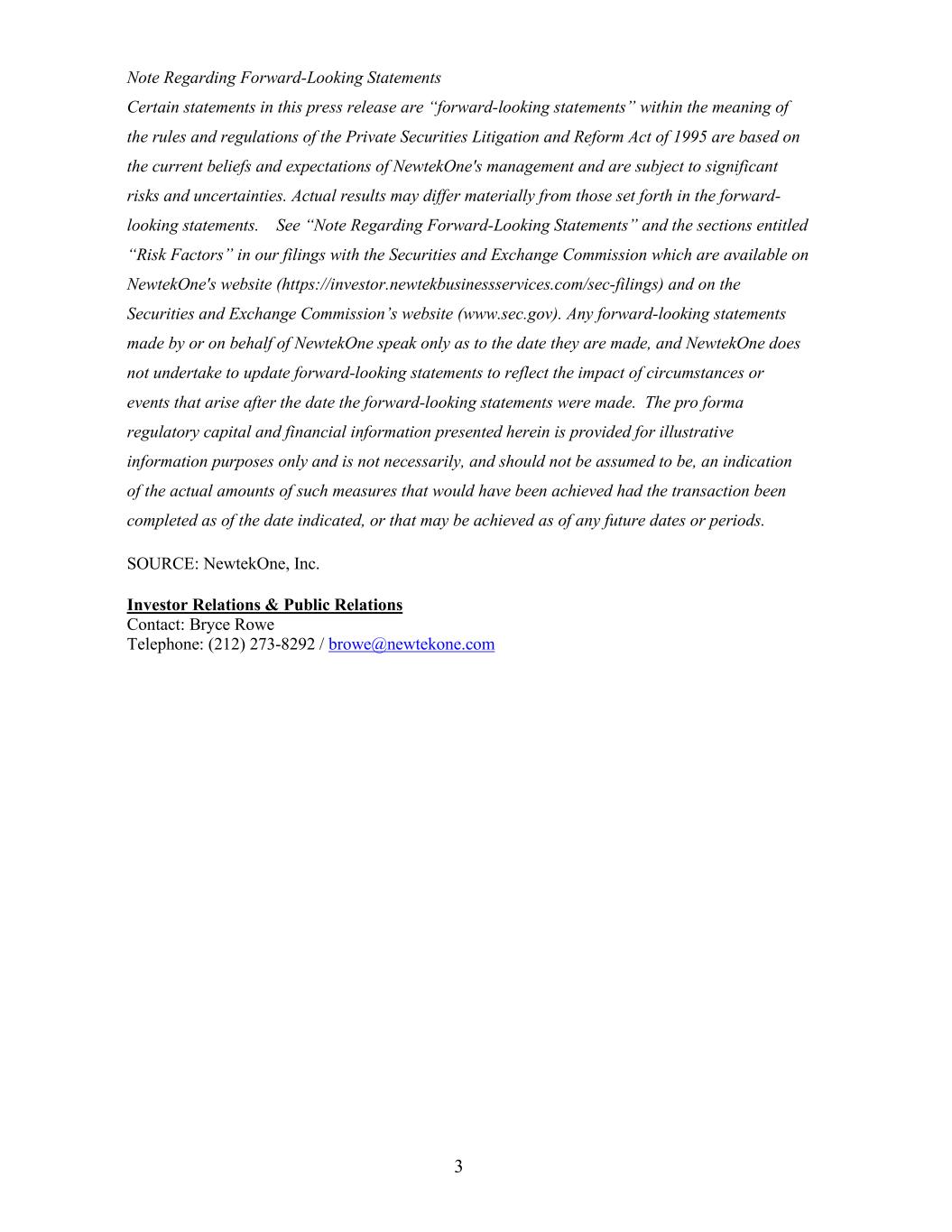 3 Note Regarding Forward-Looking Statements Certain statements in this press release are “forward-looking statements” within the meaning of the rules and regulations of the Private Securities Litigation and Reform Act of 1995 are based on the current beliefs and expectations of NewtekOne's management and are subject to significant risks and uncertainties. Actual results may differ materially from those set forth in the forward- looking statements. See “Note Regarding Forward-Looking Statements” and the sections entitled “Risk Factors” in our filings with the Securities and Exchange Commission which are available on NewtekOne's website (https://investor.newtekbusinessservices.com/sec-filings) and on the Securities and Exchange Commission’s website (www.sec.gov). Any forward-looking statements made by or on behalf of NewtekOne speak only as to the date they are made, and NewtekOne does not undertake to update forward-looking statements to reflect the impact of circumstances or events that arise after the date the forward-looking statements were made. The pro forma regulatory capital and financial information presented herein is provided for illustrative information purposes only and is not necessarily, and should not be assumed to be, an indication of the actual amounts of such measures that would have been achieved had the transaction been completed as of the date indicated, or that may be achieved as of any future dates or periods. SOURCE: NewtekOne, Inc. Investor Relations & Public Relations Contact: Bryce Rowe Telephone: (212) 273-8292 / browe@newtekone.com