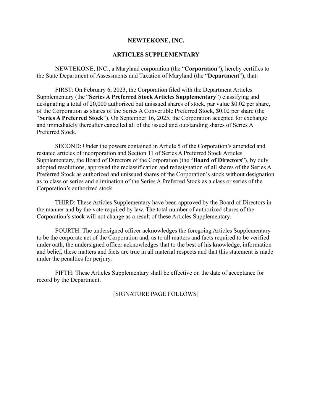 NEWTEKONE, INC. ARTICLES SUPPLEMENTARY NEWTEKONE, INC., a Maryland corporation (the “Corporation”), hereby certifies to the State Department of Assessments and Taxation of Maryland (the “Department”), that: FIRST: On February 6, 2023, the Corporation filed with the Department Articles Supplementary (the “Series A Preferred Stock Articles Supplementary”) classifying and designating a total of 20,000 authorized but unissued shares of stock, par value $0.02 per share, of the Corporation as shares of the Series A Convertible Preferred Stock, $0.02 per share (the “Series A Preferred Stock”). On September 16, 2025, the Corporation accepted for exchange and immediately thereafter cancelled all of the issued and outstanding shares of Series A Preferred Stock. SECOND: Under the powers contained in Article 5 of the Corporation’s amended and restated articles of incorporation and Section 11 of Series A Preferred Stock Articles Supplementary, the Board of Directors of the Corporation (the “Board of Directors”), by duly adopted resolutions, approved the reclassification and redesignation of all shares of the Series A Preferred Stock as authorized and unissued shares of the Corporation’s stock without designation as to class or series and elimination of the Series A Preferred Stock as a class or series of the Corporation’s authorized stock. THIRD: These Articles Supplementary have been approved by the Board of Directors in the manner and by the vote required by law. The total number of authorized shares of the Corporation’s stock will not change as a result of these Articles Supplementary. FOURTH: The undersigned officer acknowledges the foregoing Articles Supplementary to be the corporate act of the Corporation and, as to all matters and facts required to be verified under oath, the undersigned officer acknowledges that to the best of his knowledge, information and belief, these matters and facts are true in all material respects and that this statement is made under the penalties for perjury. FIFTH: These Articles Supplementary shall be effective on the date of acceptance for record by the Department. [SIGNATURE PAGE FOLLOWS]