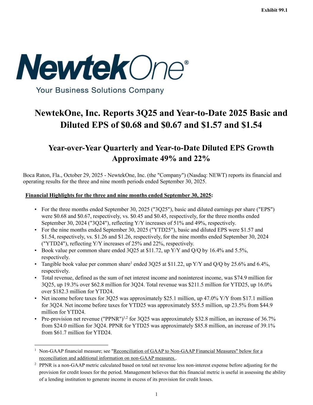 Exhibit 99.1 1 NewtekOne, Inc. Reports 3Q25 and Year-to-Date 2025 Basic and Diluted EPS of $0.68 and $0.67 and $1.57 and $1.54 Year-over-Year Quarterly and Year-to-Date Diluted EPS Growth Approximate 49% and 22% Boca Raton, Fla., October 29, 2025 - NewtekOne, Inc. (the "Company") (Nasdaq: NEWT) reports its financial and operating results for the three and nine month periods ended September 30, 2025. Financial Highlights for the three and nine months ended September 30, 2025: • For the three months ended September 30, 2025 ("3Q25"), basic and diluted earnings per share ("EPS") were $0.68 and $0.67, respectively, vs. $0.45 and $0.45, respectively, for the three months ended September 30, 2024 ("3Q24"), reflecting Y/Y increases of 51% and 49%, respectively. • For the nine months ended September 30, 2025 ("YTD25"), basic and diluted EPS were $1.57 and $1.54, respectively, vs. $1.26 and $1.26, respectively, for the nine months ended September 30, 2024 ("YTD24"), reflecting Y/Y increases of 25% and 22%, respectively. • Book value per common share ended 3Q25 at $11.72, up Y/Y and Q/Q by 16.4% and 5.5%, respectively. • Tangible book value per common share1 ended 3Q25 at $11.22, up Y/Y and Q/Q by 25.6% and 6.4%, respectively. • Total revenue, defined as the sum of net interest income and noninterest income, was $74.9 million for 3Q25, up 19.3% over $62.8 million for 3Q24. Total revenue was $211.5 million for YTD25, up 16.0% over $182.3 million for YTD24. • Net income before taxes for 3Q25 was approximately $25.1 million, up 47.0% Y/Y from $17.1 million for 3Q24. Net income before taxes for YTD25 was approximately $55.5 million, up 23.5% from $44.9 million for YTD24. • Pre-provision net revenue ("PPNR")1,2 for 3Q25 was approximately $32.8 million, an increase of 36.7% from $24.0 million for 3Q24. PPNR for YTD25 was approximately $85.8 million, an increase of 39.1% from $61.7 million for YTD24. 1 Non-GAAP financial measure; see "Reconciliation of GAAP to Non-GAAP Financial Measures" below for a reconciliation and additional information on non-GAAP measures.. 2 PPNR is a non-GAAP metric calculated based on total net revenue less non-interest expense before adjusting for the provision for credit losses for the period. Management believes that this financial metric is useful in assessing the ability of a lending institution to generate income in excess of its provision for credit losses.