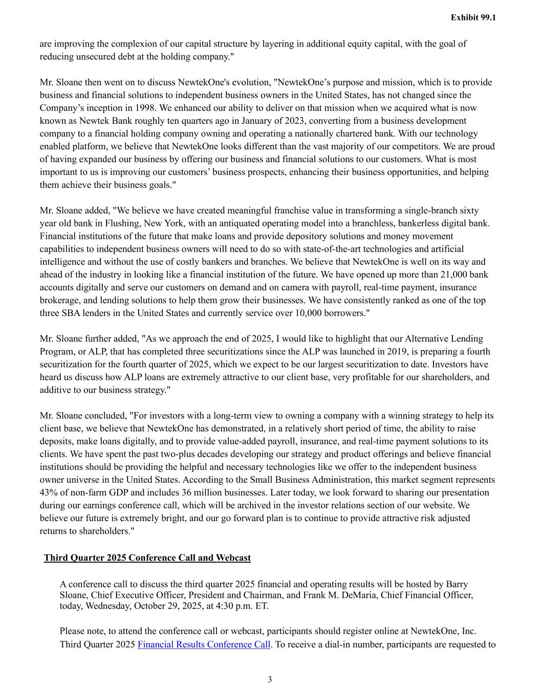 Exhibit 99.1 3 are improving the complexion of our capital structure by layering in additional equity capital, with the goal of reducing unsecured debt at the holding company." Mr. Sloane then went on to discuss NewtekOne's evolution, "NewtekOne’s purpose and mission, which is to provide business and financial solutions to independent business owners in the United States, has not changed since the Company’s inception in 1998. We enhanced our ability to deliver on that mission when we acquired what is now known as Newtek Bank roughly ten quarters ago in January of 2023, converting from a business development company to a financial holding company owning and operating a nationally chartered bank. With our technology enabled platform, we believe that NewtekOne looks different than the vast majority of our competitors. We are proud of having expanded our business by offering our business and financial solutions to our customers. What is most important to us is improving our customers’ business prospects, enhancing their business opportunities, and helping them achieve their business goals." Mr. Sloane added, "We believe we have created meaningful franchise value in transforming a single-branch sixty year old bank in Flushing, New York, with an antiquated operating model into a branchless, bankerless digital bank. Financial institutions of the future that make loans and provide depository solutions and money movement capabilities to independent business owners will need to do so with state-of-the-art technologies and artificial intelligence and without the use of costly bankers and branches. We believe that NewtekOne is well on its way and ahead of the industry in looking like a financial institution of the future. We have opened up more than 21,000 bank accounts digitally and serve our customers on demand and on camera with payroll, real-time payment, insurance brokerage, and lending solutions to help them grow their businesses. We have consistently ranked as one of the top three SBA lenders in the United States and currently service over 10,000 borrowers." Mr. Sloane further added, "As we approach the end of 2025, I would like to highlight that our Alternative Lending Program, or ALP, that has completed three securitizations since the ALP was launched in 2019, is preparing a fourth securitization for the fourth quarter of 2025, which we expect to be our largest securitization to date. Investors have heard us discuss how ALP loans are extremely attractive to our client base, very profitable for our shareholders, and additive to our business strategy." Mr. Sloane concluded, "For investors with a long-term view to owning a company with a winning strategy to help its client base, we believe that NewtekOne has demonstrated, in a relatively short period of time, the ability to raise deposits, make loans digitally, and to provide value-added payroll, insurance, and real-time payment solutions to its clients. We have spent the past two-plus decades developing our strategy and product offerings and believe financial institutions should be providing the helpful and necessary technologies like we offer to the independent business owner universe in the United States. According to the Small Business Administration, this market segment represents 43% of non-farm GDP and includes 36 million businesses. Later today, we look forward to sharing our presentation during our earnings conference call, which will be archived in the investor relations section of our website. We believe our future is extremely bright, and our go forward plan is to continue to provide attractive risk adjusted returns to shareholders." Third Quarter 2025 Conference Call and Webcast A conference call to discuss the third quarter 2025 financial and operating results will be hosted by Barry Sloane, Chief Executive Officer, President and Chairman, and Frank M. DeMaria, Chief Financial Officer, today, Wednesday, October 29, 2025, at 4:30 p.m. ET. Please note, to attend the conference call or webcast, participants should register online at NewtekOne, Inc. Third Quarter 2025 Financial Results Conference Call. To receive a dial-in number, participants are requested to
