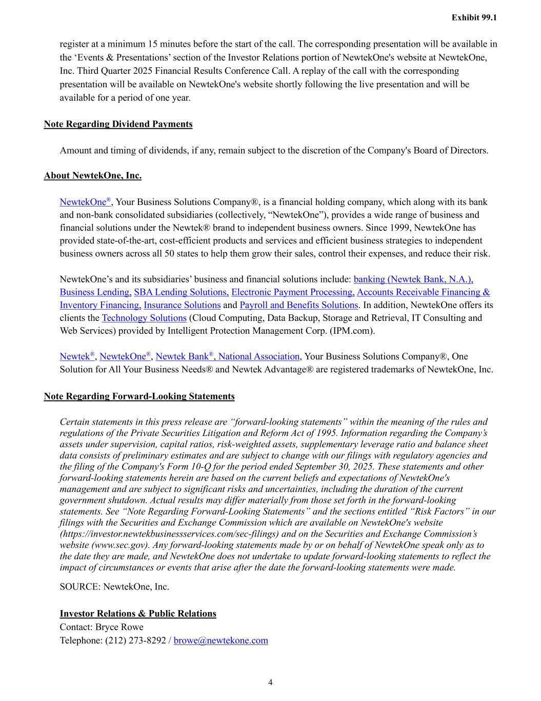 Exhibit 99.1 4 register at a minimum 15 minutes before the start of the call. The corresponding presentation will be available in the ‘Events & Presentations’ section of the Investor Relations portion of NewtekOne's website at NewtekOne, Inc. Third Quarter 2025 Financial Results Conference Call. A replay of the call with the corresponding presentation will be available on NewtekOne's website shortly following the live presentation and will be available for a period of one year. Note Regarding Dividend Payments Amount and timing of dividends, if any, remain subject to the discretion of the Company's Board of Directors. About NewtekOne, Inc. NewtekOne®, Your Business Solutions Company®, is a financial holding company, which along with its bank and non-bank consolidated subsidiaries (collectively, “NewtekOne”), provides a wide range of business and financial solutions under the Newtek® brand to independent business owners. Since 1999, NewtekOne has provided state-of-the-art, cost-efficient products and services and efficient business strategies to independent business owners across all 50 states to help them grow their sales, control their expenses, and reduce their risk. NewtekOne’s and its subsidiaries’ business and financial solutions include: banking (Newtek Bank, N.A.), Business Lending, SBA Lending Solutions, Electronic Payment Processing, Accounts Receivable Financing & Inventory Financing, Insurance Solutions and Payroll and Benefits Solutions. In addition, NewtekOne offers its clients the Technology Solutions (Cloud Computing, Data Backup, Storage and Retrieval, IT Consulting and Web Services) provided by Intelligent Protection Management Corp. (IPM.com). Newtek®, NewtekOne®, Newtek Bank®, National Association, Your Business Solutions Company®, One Solution for All Your Business Needs® and Newtek Advantage® are registered trademarks of NewtekOne, Inc. Note Regarding Forward-Looking Statements Certain statements in this press release are “forward-looking statements” within the meaning of the rules and regulations of the Private Securities Litigation and Reform Act of 1995. Information regarding the Company’s assets under supervision, capital ratios, risk-weighted assets, supplementary leverage ratio and balance sheet data consists of preliminary estimates and are subject to change with our filings with regulatory agencies and the filing of the Company's Form 10-Q for the period ended September 30, 2025. These statements and other forward-looking statements herein are based on the current beliefs and expectations of NewtekOne's management and are subject to significant risks and uncertainties, including the duration of the current government shutdown. Actual results may differ materially from those set forth in the forward-looking statements. See “Note Regarding Forward-Looking Statements” and the sections entitled “Risk Factors” in our filings with the Securities and Exchange Commission which are available on NewtekOne's website (https://investor.newtekbusinessservices.com/sec-filings) and on the Securities and Exchange Commission’s website (www.sec.gov). Any forward-looking statements made by or on behalf of NewtekOne speak only as to the date they are made, and NewtekOne does not undertake to update forward-looking statements to reflect the impact of circumstances or events that arise after the date the forward-looking statements were made. SOURCE: NewtekOne, Inc. Investor Relations & Public Relations Contact: Bryce Rowe Telephone: (212) 273-8292 / browe@newtekone.com