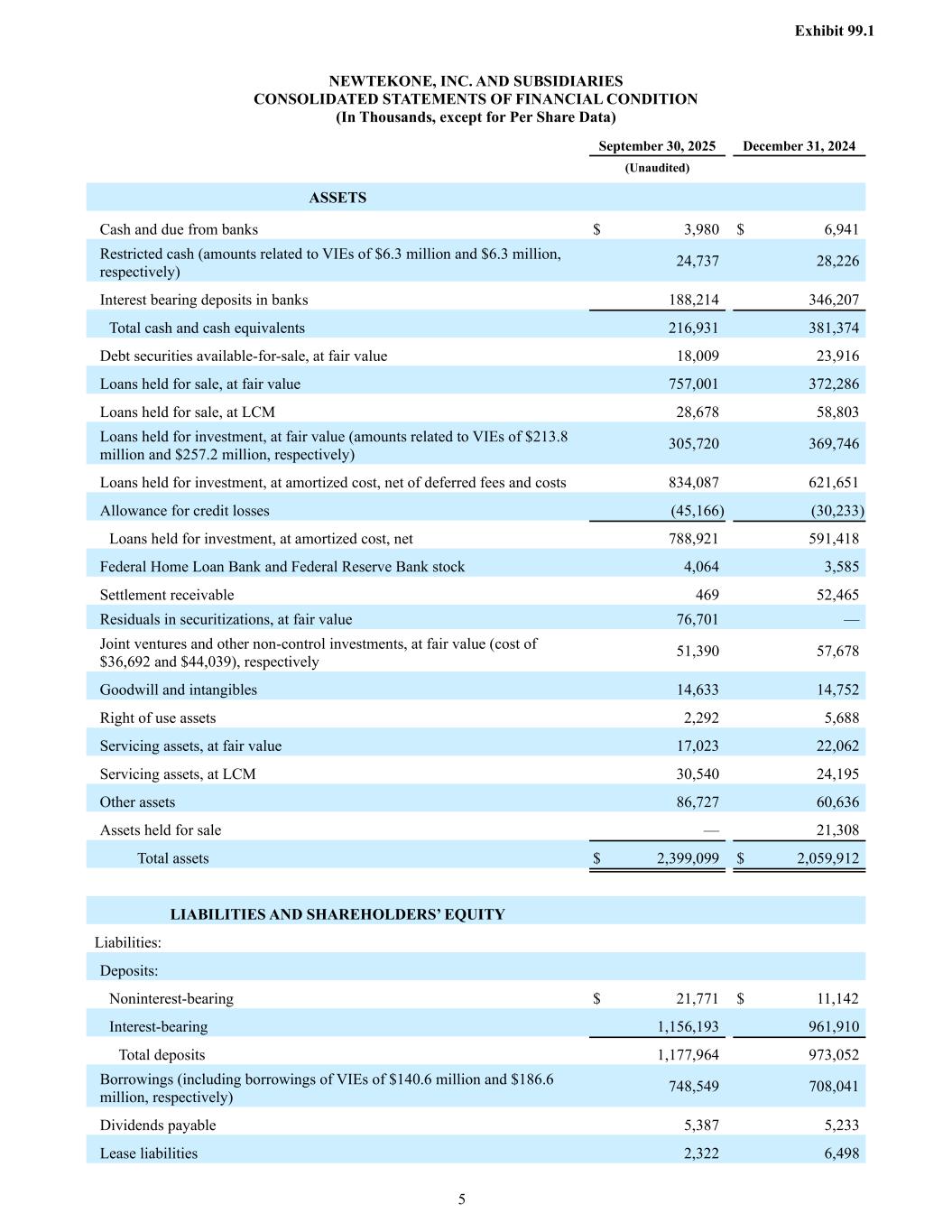 Exhibit 99.1 5 NEWTEKONE, INC. AND SUBSIDIARIES CONSOLIDATED STATEMENTS OF FINANCIAL CONDITION (In Thousands, except for Per Share Data) September 30, 2025 December 31, 2024 (Unaudited) ASSETS Cash and due from banks $ 3,980 $ 6,941 Restricted cash (amounts related to VIEs of $6.3 million and $6.3 million, respectively) 24,737 28,226 Interest bearing deposits in banks 188,214 346,207 Total cash and cash equivalents 216,931 381,374 Debt securities available-for-sale, at fair value 18,009 23,916 Loans held for sale, at fair value 757,001 372,286 Loans held for sale, at LCM 28,678 58,803 Loans held for investment, at fair value (amounts related to VIEs of $213.8 million and $257.2 million, respectively) 305,720 369,746 Loans held for investment, at amortized cost, net of deferred fees and costs 834,087 621,651 Allowance for credit losses (45,166) (30,233) Loans held for investment, at amortized cost, net 788,921 591,418 Federal Home Loan Bank and Federal Reserve Bank stock 4,064 3,585 Settlement receivable 469 52,465 Residuals in securitizations, at fair value 76,701 — Joint ventures and other non-control investments, at fair value (cost of $36,692 and $44,039), respectively 51,390 57,678 Goodwill and intangibles 14,633 14,752 Right of use assets 2,292 5,688 Servicing assets, at fair value 17,023 22,062 Servicing assets, at LCM 30,540 24,195 Other assets 86,727 60,636 Assets held for sale — 21,308 Total assets $ 2,399,099 $ 2,059,912 LIABILITIES AND SHAREHOLDERS’ EQUITY Liabilities: Deposits: Noninterest-bearing $ 21,771 $ 11,142 Interest-bearing 1,156,193 961,910 Total deposits 1,177,964 973,052 Borrowings (including borrowings of VIEs of $140.6 million and $186.6 million, respectively) 748,549 708,041 Dividends payable 5,387 5,233 Lease liabilities 2,322 6,498