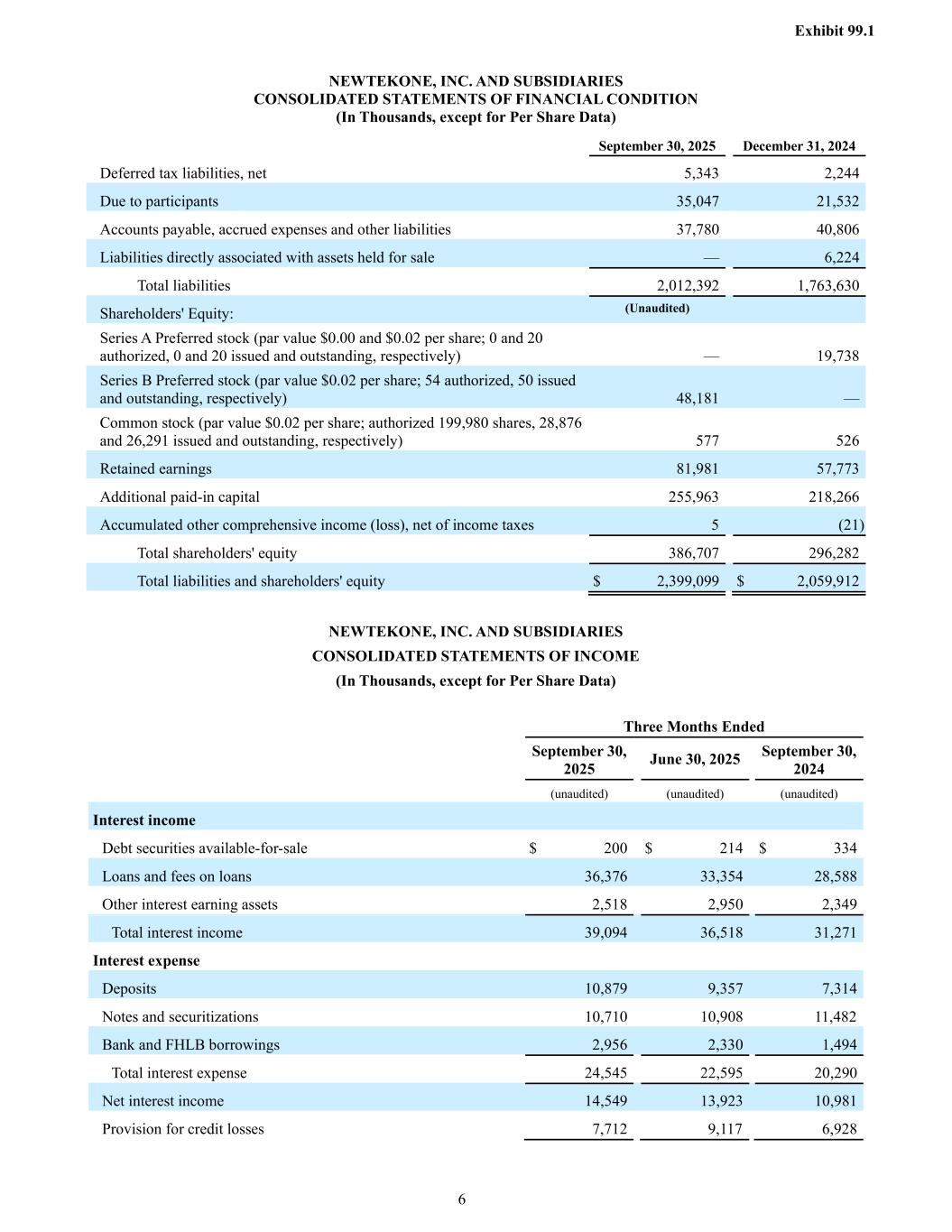 Exhibit 99.1 6 NEWTEKONE, INC. AND SUBSIDIARIES CONSOLIDATED STATEMENTS OF FINANCIAL CONDITION (In Thousands, except for Per Share Data) September 30, 2025 December 31, 2024 Deferred tax liabilities, net 5,343 2,244 Due to participants 35,047 21,532 Accounts payable, accrued expenses and other liabilities 37,780 40,806 Liabilities directly associated with assets held for sale — 6,224 Total liabilities 2,012,392 1,763,630 Shareholders' Equity: (Unaudited) Series A Preferred stock (par value $0.00 and $0.02 per share; 0 and 20 authorized, 0 and 20 issued and outstanding, respectively) — 19,738 Series B Preferred stock (par value $0.02 per share; 54 authorized, 50 issued and outstanding, respectively) 48,181 — Common stock (par value $0.02 per share; authorized 199,980 shares, 28,876 and 26,291 issued and outstanding, respectively) 577 526 Retained earnings 81,981 57,773 Additional paid-in capital 255,963 218,266 Accumulated other comprehensive income (loss), net of income taxes 5 (21) Total shareholders' equity 386,707 296,282 Total liabilities and shareholders' equity $ 2,399,099 $ 2,059,912 NEWTEKONE, INC. AND SUBSIDIARIES CONSOLIDATED STATEMENTS OF INCOME (In Thousands, except for Per Share Data) Three Months Ended September 30, 2025 June 30, 2025 September 30, 2024 (unaudited) (unaudited) (unaudited) Interest income Debt securities available-for-sale $ 200 $ 214 $ 334 Loans and fees on loans 36,376 33,354 28,588 Other interest earning assets 2,518 2,950 2,349 Total interest income 39,094 36,518 31,271 Interest expense Deposits 10,879 9,357 7,314 Notes and securitizations 10,710 10,908 11,482 Bank and FHLB borrowings 2,956 2,330 1,494 Total interest expense 24,545 22,595 20,290 Net interest income 14,549 13,923 10,981 Provision for credit losses 7,712 9,117 6,928