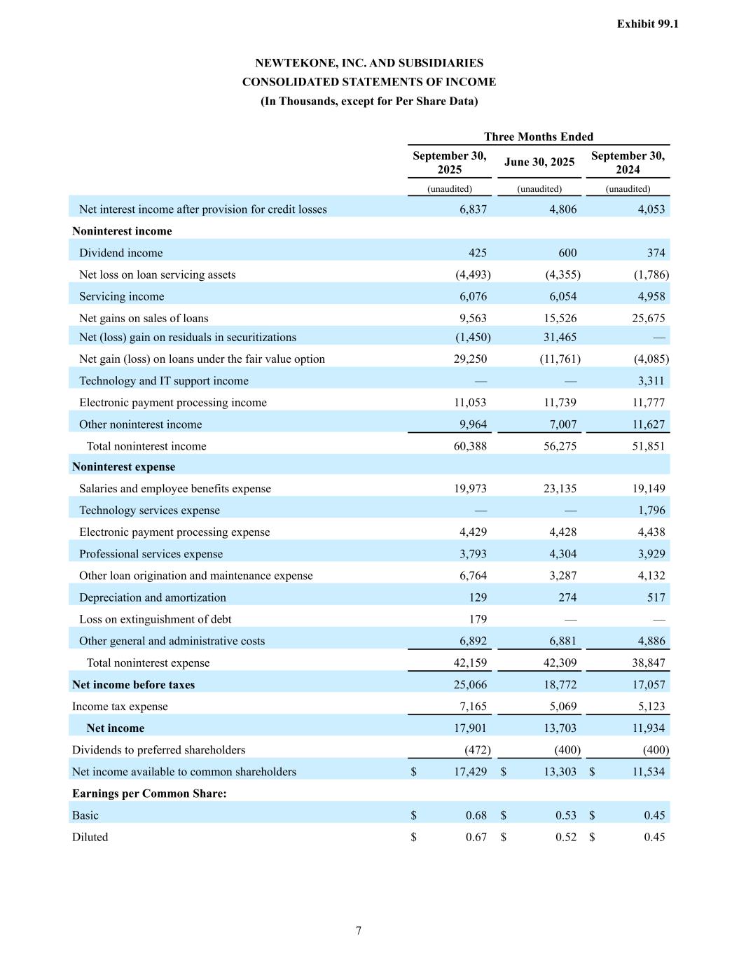 Exhibit 99.1 7 NEWTEKONE, INC. AND SUBSIDIARIES CONSOLIDATED STATEMENTS OF INCOME (In Thousands, except for Per Share Data) Three Months Ended September 30, 2025 June 30, 2025 September 30, 2024 (unaudited) (unaudited) (unaudited) Net interest income after provision for credit losses 6,837 4,806 4,053 Noninterest income Dividend income 425 600 374 Net loss on loan servicing assets (4,493) (4,355) (1,786) Servicing income 6,076 6,054 4,958 Net gains on sales of loans 9,563 15,526 25,675 Net (loss) gain on residuals in securitizations (1,450) 31,465 — Net gain (loss) on loans under the fair value option 29,250 (11,761) (4,085) Technology and IT support income — — 3,311 Electronic payment processing income 11,053 11,739 11,777 Other noninterest income 9,964 7,007 11,627 Total noninterest income 60,388 56,275 51,851 Noninterest expense Salaries and employee benefits expense 19,973 23,135 19,149 Technology services expense — — 1,796 Electronic payment processing expense 4,429 4,428 4,438 Professional services expense 3,793 4,304 3,929 Other loan origination and maintenance expense 6,764 3,287 4,132 Depreciation and amortization 129 274 517 Loss on extinguishment of debt 179 — — Other general and administrative costs 6,892 6,881 4,886 Total noninterest expense 42,159 42,309 38,847 Net income before taxes 25,066 18,772 17,057 Income tax expense 7,165 5,069 5,123 Net income 17,901 13,703 11,934 Dividends to preferred shareholders (472) (400) (400) Net income available to common shareholders $ 17,429 $ 13,303 $ 11,534 Earnings per Common Share: Basic $ 0.68 $ 0.53 $ 0.45 Diluted $ 0.67 $ 0.52 $ 0.45