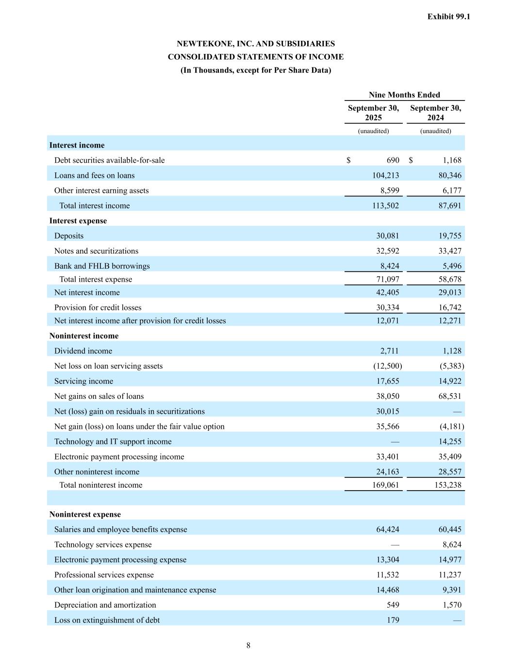 Exhibit 99.1 8 NEWTEKONE, INC. AND SUBSIDIARIES CONSOLIDATED STATEMENTS OF INCOME (In Thousands, except for Per Share Data) Nine Months Ended September 30, 2025 September 30, 2024 (unaudited) (unaudited) Interest income Debt securities available-for-sale $ 690 $ 1,168 Loans and fees on loans 104,213 80,346 Other interest earning assets 8,599 6,177 Total interest income 113,502 87,691 Interest expense Deposits 30,081 19,755 Notes and securitizations 32,592 33,427 Bank and FHLB borrowings 8,424 5,496 Total interest expense 71,097 58,678 Net interest income 42,405 29,013 Provision for credit losses 30,334 16,742 Net interest income after provision for credit losses 12,071 12,271 Noninterest income Dividend income 2,711 1,128 Net loss on loan servicing assets (12,500) (5,383) Servicing income 17,655 14,922 Net gains on sales of loans 38,050 68,531 Net (loss) gain on residuals in securitizations 30,015 — Net gain (loss) on loans under the fair value option 35,566 (4,181) Technology and IT support income — 14,255 Electronic payment processing income 33,401 35,409 Other noninterest income 24,163 28,557 Total noninterest income 169,061 153,238 Noninterest expense Salaries and employee benefits expense 64,424 60,445 Technology services expense — 8,624 Electronic payment processing expense 13,304 14,977 Professional services expense 11,532 11,237 Other loan origination and maintenance expense 14,468 9,391 Depreciation and amortization 549 1,570 Loss on extinguishment of debt 179 —