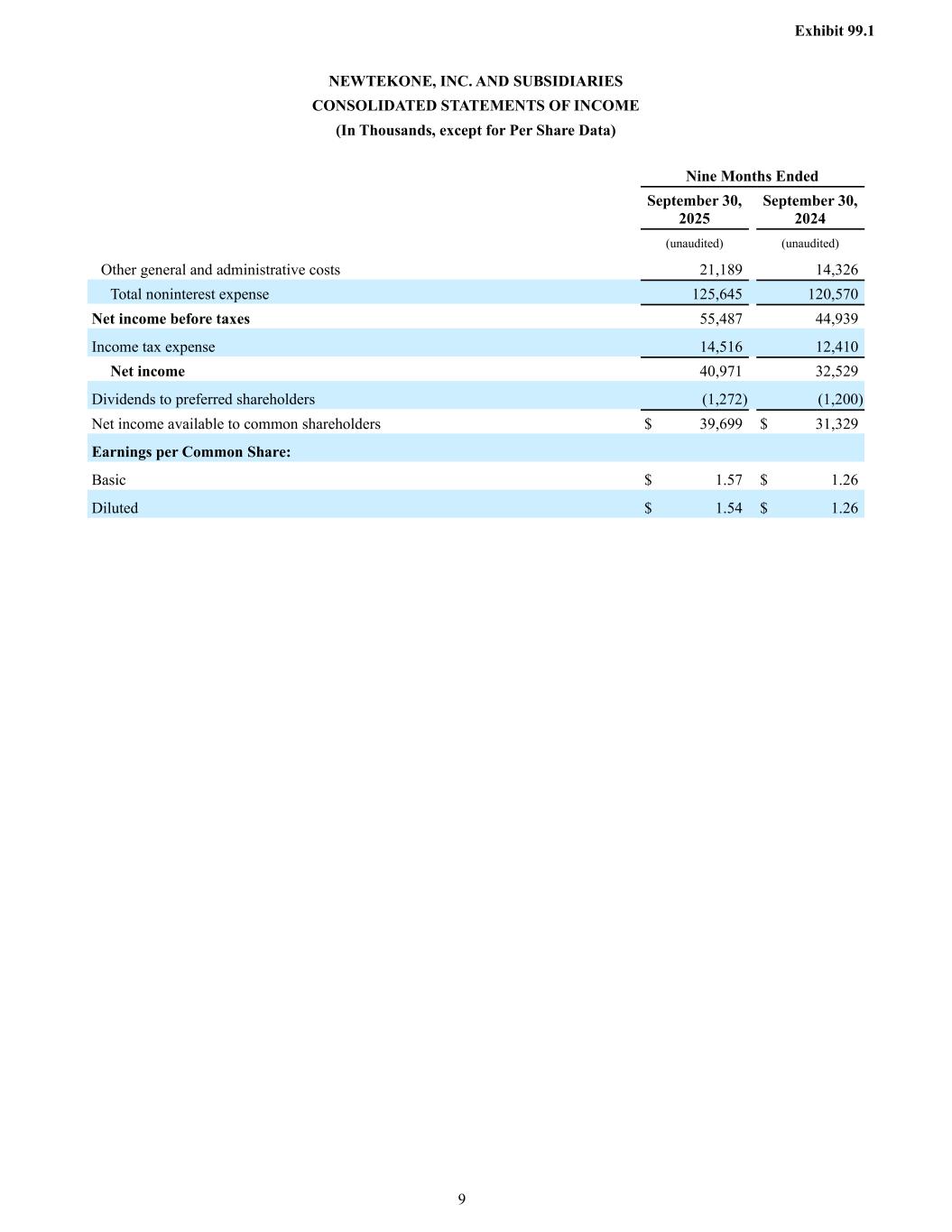 Exhibit 99.1 9 NEWTEKONE, INC. AND SUBSIDIARIES CONSOLIDATED STATEMENTS OF INCOME (In Thousands, except for Per Share Data) Nine Months Ended September 30, 2025 September 30, 2024 (unaudited) (unaudited) Other general and administrative costs 21,189 14,326 Total noninterest expense 125,645 120,570 Net income before taxes 55,487 44,939 Income tax expense 14,516 12,410 Net income 40,971 32,529 Dividends to preferred shareholders (1,272) (1,200) Net income available to common shareholders $ 39,699 $ 31,329 Earnings per Common Share: Basic $ 1.57 $ 1.26 Diluted $ 1.54 $ 1.26