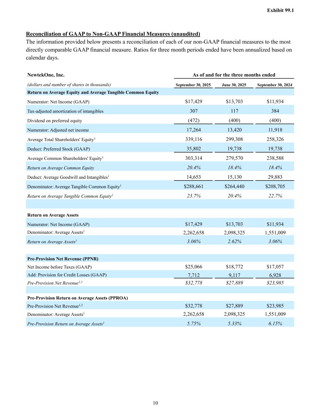 Exhibit 99.1 10 Reconciliation of GAAP to Non-GAAP Financial Measures (unaudited) The information provided below presents a reconciliation of each of our non-GAAP financial measures to the most directly comparable GAAP financial measure. Ratios for three month periods ended have been annualized based on calendar days. NewtekOne, Inc. As of and for the three months ended (dollars and number of shares in thousands) September 30, 2025 June 30, 2025 September 30, 2024 Return on Average Equity and Average Tangible Common Equity Numerator: Net Income (GAAP) $17,429 $13,703 $11,934 Tax-adjusted amortization of intangibles 307 117 384 Dividend on preferred equity (472) (400) (400) Numerator: Adjusted net income 17,264 13,420 11,918 Average Total Shareholders' Equity1 339,116 299,308 258,326 Deduct: Preferred Stock (GAAP) 35,802 19,738 19,738 Average Common Shareholders' Equity1 303,314 279,570 238,588 Return on Average Common Equity 20.4% 18.4% 18.4% Deduct: Average Goodwill and Intangibles1 14,653 15,130 29,883 Denominator: Average Tangible Common Equity1 $288,661 $264,440 $208,705 Return on Average Tangible Common Equity1 23.7% 20.4% 22.7% Return on Average Assets Numerator: Net Income (GAAP) $17,429 $13,703 $11,934 Denominator: Average Assets1 2,262,658 2,098,325 1,551,009 Return on Average Assets1 3.06% 2.62% 3.06% Pre-Provision Net Revenue (PPNR) Net Income before Taxes (GAAP) $25,066 $18,772 $17,057 Add: Provision for Credit Losses (GAAP) 7,712 9,117 6,928 Pre-Provision Net Revenue1,2 $32,778 $27,889 $23,985 Pre-Provision Return on Average Assets (PPROA) Pre-Provision Net Revenue1,2 $32,778 $27,889 $23,985 Denominator: Average Assets1 2,262,658 2,098,325 1,551,009 Pre-Provision Return on Average Assets1 5.75% 5.33% 6.15%
