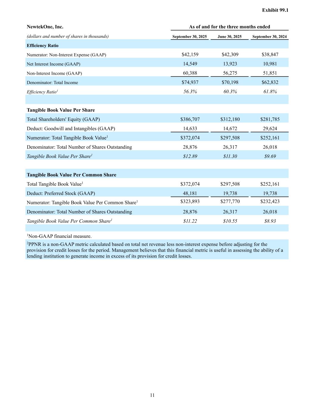 Exhibit 99.1 11 NewtekOne, Inc. As of and for the three months ended (dollars and number of shares in thousands) September 30, 2025 June 30, 2025 September 30, 2024 Efficiency Ratio Numerator: Non-Interest Expense (GAAP) $42,159 $42,309 $38,847 Net Interest Income (GAAP) 14,549 13,923 10,981 Non-Interest Income (GAAP) 60,388 56,275 51,851 Denominator: Total Income $74,937 $70,198 $62,832 Efficiency Ratio1 56.3% 60.3% 61.8% Tangible Book Value Per Share Total Shareholders' Equity (GAAP) $386,707 $312,180 $281,785 Deduct: Goodwill and Intangibles (GAAP) 14,633 14,672 29,624 Numerator: Total Tangible Book Value1 $372,074 $297,508 $252,161 Denominator: Total Number of Shares Outstanding 28,876 26,317 26,018 Tangible Book Value Per Share1 $12.89 $11.30 $9.69 Tangible Book Value Per Common Share Total Tangible Book Value1 $372,074 $297,508 $252,161 Deduct: Preferred Stock (GAAP) 48,181 19,738 19,738 Numerator: Tangible Book Value Per Common Share1 $323,893 $277,770 $232,423 Denominator: Total Number of Shares Outstanding 28,876 26,317 26,018 Tangible Book Value Per Common Share1 $11.22 $10.55 $8.93 1Non-GAAP financial measure. 2PPNR is a non-GAAP metric calculated based on total net revenue less non-interest expense before adjusting for the provision for credit losses for the period. Management believes that this financial metric is useful in assessing the ability of a lending institution to generate income in excess of its provision for credit losses.