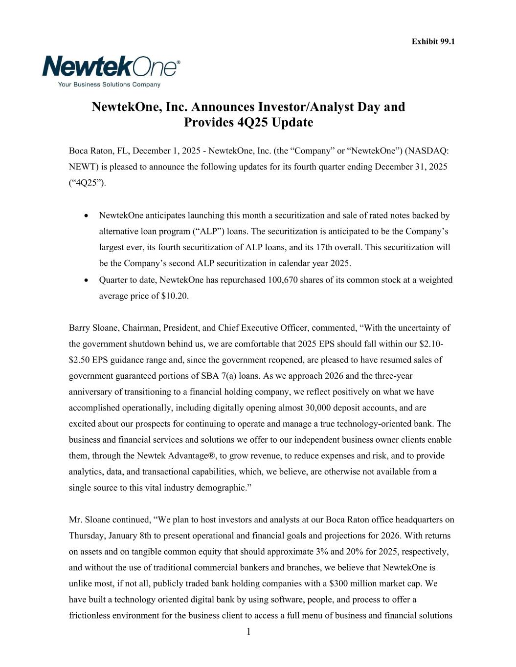 1 Exhibit 99.1 NewtekOne, Inc. Announces Investor/Analyst Day and Provides 4Q25 Update Boca Raton, FL, December 1, 2025 - NewtekOne, Inc. (the “Company” or “NewtekOne”) (NASDAQ: NEWT) is pleased to announce the following updates for its fourth quarter ending December 31, 2025 (“4Q25”).  NewtekOne anticipates launching this month a securitization and sale of rated notes backed by alternative loan program (“ALP”) loans. The securitization is anticipated to be the Company’s largest ever, its fourth securitization of ALP loans, and its 17th overall. This securitization will be the Company’s second ALP securitization in calendar year 2025.  Quarter to date, NewtekOne has repurchased 100,670 shares of its common stock at a weighted average price of $10.20. Barry Sloane, Chairman, President, and Chief Executive Officer, commented, “With the uncertainty of the government shutdown behind us, we are comfortable that 2025 EPS should fall within our $2.10- $2.50 EPS guidance range and, since the government reopened, are pleased to have resumed sales of government guaranteed portions of SBA 7(a) loans. As we approach 2026 and the three-year anniversary of transitioning to a financial holding company, we reflect positively on what we have accomplished operationally, including digitally opening almost 30,000 deposit accounts, and are excited about our prospects for continuing to operate and manage a true technology-oriented bank. The business and financial services and solutions we offer to our independent business owner clients enable them, through the Newtek Advantage®, to grow revenue, to reduce expenses and risk, and to provide analytics, data, and transactional capabilities, which, we believe, are otherwise not available from a single source to this vital industry demographic.” Mr. Sloane continued, “We plan to host investors and analysts at our Boca Raton office headquarters on Thursday, January 8th to present operational and financial goals and projections for 2026. With returns on assets and on tangible common equity that should approximate 3% and 20% for 2025, respectively, and without the use of traditional commercial bankers and branches, we believe that NewtekOne is unlike most, if not all, publicly traded bank holding companies with a $300 million market cap. We have built a technology oriented digital bank by using software, people, and process to offer a frictionless environment for the business client to access a full menu of business and financial solutions