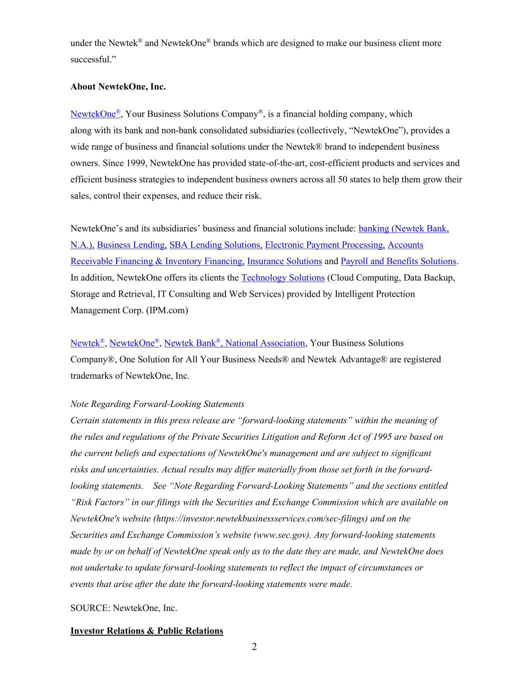 2 under the Newtek® and NewtekOne® brands which are designed to make our business client more successful.” About NewtekOne, Inc. NewtekOne®, Your Business Solutions Company®, is a financial holding company, which along with its bank and non-bank consolidated subsidiaries (collectively, “NewtekOne”), provides a wide range of business and financial solutions under the Newtek® brand to independent business owners. Since 1999, NewtekOne has provided state-of-the-art, cost-efficient products and services and efficient business strategies to independent business owners across all 50 states to help them grow their sales, control their expenses, and reduce their risk. NewtekOne’s and its subsidiaries’ business and financial solutions include: banking (Newtek Bank, N.A.), Business Lending, SBA Lending Solutions, Electronic Payment Processing, Accounts Receivable Financing & Inventory Financing, Insurance Solutions and Payroll and Benefits Solutions. In addition, NewtekOne offers its clients the Technology Solutions (Cloud Computing, Data Backup, Storage and Retrieval, IT Consulting and Web Services) provided by Intelligent Protection Management Corp. (IPM.com) Newtek®, NewtekOne®, Newtek Bank®, National Association, Your Business Solutions Company®, One Solution for All Your Business Needs® and Newtek Advantage® are registered trademarks of NewtekOne, Inc. Note Regarding Forward-Looking Statements Certain statements in this press release are “forward-looking statements” within the meaning of the rules and regulations of the Private Securities Litigation and Reform Act of 1995 are based on the current beliefs and expectations of NewtekOne's management and are subject to significant risks and uncertainties. Actual results may differ materially from those set forth in the forward- looking statements. See “Note Regarding Forward-Looking Statements” and the sections entitled “Risk Factors” in our filings with the Securities and Exchange Commission which are available on NewtekOne's website (https://investor.newtekbusinessservices.com/sec-filings) and on the Securities and Exchange Commission’s website (www.sec.gov). Any forward-looking statements made by or on behalf of NewtekOne speak only as to the date they are made, and NewtekOne does not undertake to update forward-looking statements to reflect the impact of circumstances or events that arise after the date the forward-looking statements were made. SOURCE: NewtekOne, Inc. Investor Relations & Public Relations