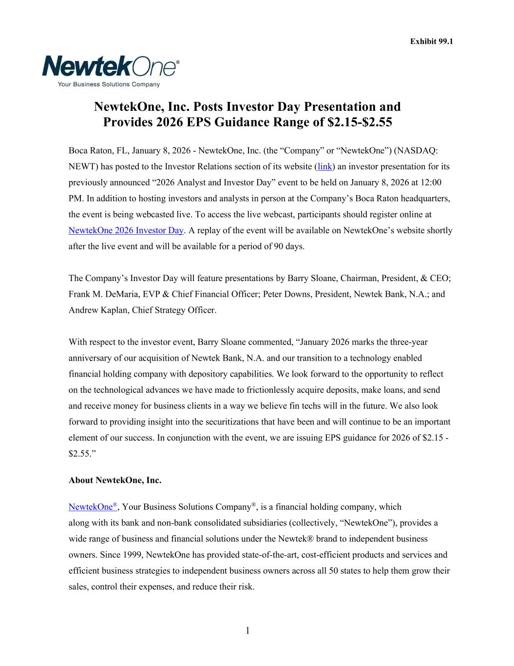 1 Exhibit 99.1 NewtekOne, Inc. Posts Investor Day Presentation and Provides 2026 EPS Guidance Range of $2.15-$2.55 Boca Raton, FL, January 8, 2026 - NewtekOne, Inc. (the “Company” or “NewtekOne”) (NASDAQ: NEWT) has posted to the Investor Relations section of its website (link) an investor presentation for its previously announced “2026 Analyst and Investor Day” event to be held on January 8, 2026 at 12:00 PM. In addition to hosting investors and analysts in person at the Company’s Boca Raton headquarters, the event is being webcasted live. To access the live webcast, participants should register online at NewtekOne 2026 Investor Day. A replay of the event will be available on NewtekOne’s website shortly after the live event and will be available for a period of 90 days. The Company’s Investor Day will feature presentations by Barry Sloane, Chairman, President, & CEO; Frank M. DeMaria, EVP & Chief Financial Officer; Peter Downs, President, Newtek Bank, N.A.; and Andrew Kaplan, Chief Strategy Officer. With respect to the investor event, Barry Sloane commented, “January 2026 marks the three-year anniversary of our acquisition of Newtek Bank, N.A. and our transition to a technology enabled financial holding company with depository capabilities. We look forward to the opportunity to reflect on the technological advances we have made to frictionlessly acquire deposits, make loans, and send and receive money for business clients in a way we believe fin techs will in the future. We also look forward to providing insight into the securitizations that have been and will continue to be an important element of our success. In conjunction with the event, we are issuing EPS guidance for 2026 of $2.15 - $2.55.” About NewtekOne, Inc. NewtekOne®, Your Business Solutions Company®, is a financial holding company, which along with its bank and non-bank consolidated subsidiaries (collectively, “NewtekOne”), provides a wide range of business and financial solutions under the Newtek® brand to independent business owners. Since 1999, NewtekOne has provided state-of-the-art, cost-efficient products and services and efficient business strategies to independent business owners across all 50 states to help them grow their sales, control their expenses, and reduce their risk.
