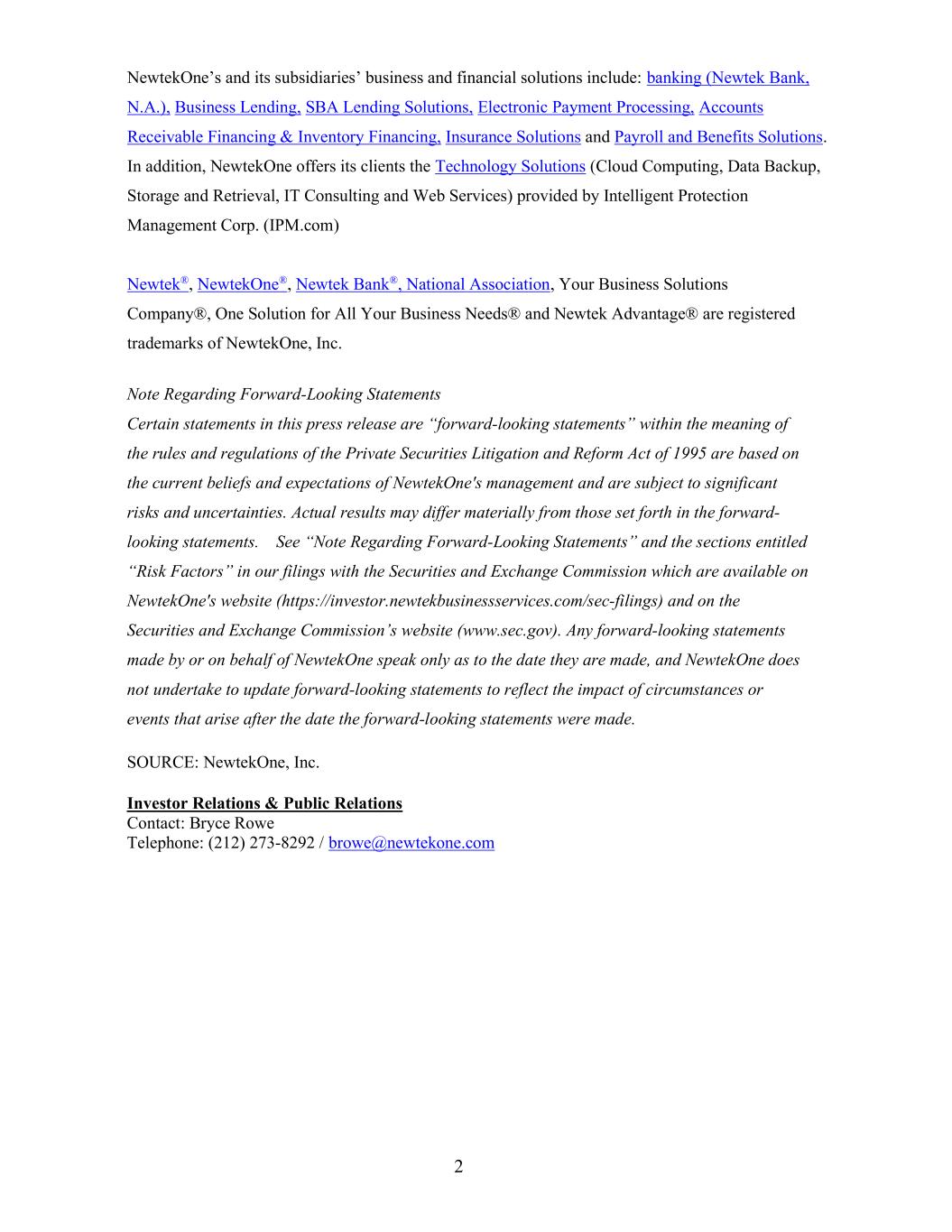 2 NewtekOne’s and its subsidiaries’ business and financial solutions include: banking (Newtek Bank, N.A.), Business Lending, SBA Lending Solutions, Electronic Payment Processing, Accounts Receivable Financing & Inventory Financing, Insurance Solutions and Payroll and Benefits Solutions. In addition, NewtekOne offers its clients the Technology Solutions (Cloud Computing, Data Backup, Storage and Retrieval, IT Consulting and Web Services) provided by Intelligent Protection Management Corp. (IPM.com) Newtek®, NewtekOne®, Newtek Bank®, National Association, Your Business Solutions Company®, One Solution for All Your Business Needs® and Newtek Advantage® are registered trademarks of NewtekOne, Inc. Note Regarding Forward-Looking Statements Certain statements in this press release are “forward-looking statements” within the meaning of the rules and regulations of the Private Securities Litigation and Reform Act of 1995 are based on the current beliefs and expectations of NewtekOne's management and are subject to significant risks and uncertainties. Actual results may differ materially from those set forth in the forward- looking statements. See “Note Regarding Forward-Looking Statements” and the sections entitled “Risk Factors” in our filings with the Securities and Exchange Commission which are available on NewtekOne's website (https://investor.newtekbusinessservices.com/sec-filings) and on the Securities and Exchange Commission’s website (www.sec.gov). Any forward-looking statements made by or on behalf of NewtekOne speak only as to the date they are made, and NewtekOne does not undertake to update forward-looking statements to reflect the impact of circumstances or events that arise after the date the forward-looking statements were made. SOURCE: NewtekOne, Inc. Investor Relations & Public Relations Contact: Bryce Rowe Telephone: (212) 273-8292 / browe@newtekone.com