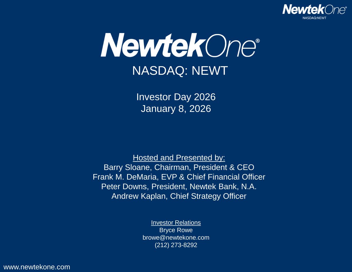 www.newtekone.com NASDAQ: NEWT Investor Day 2026 January 8, 2026 Hosted and Presented by: Barry Sloane, Chairman, President & CEO Frank M. DeMaria, EVP & Chief Financial Officer Peter Downs, President, Newtek Bank, N.A. Andrew Kaplan, Chief Strategy Officer Investor Relations Bryce Rowe browe@newtekone.com (212) 273-8292