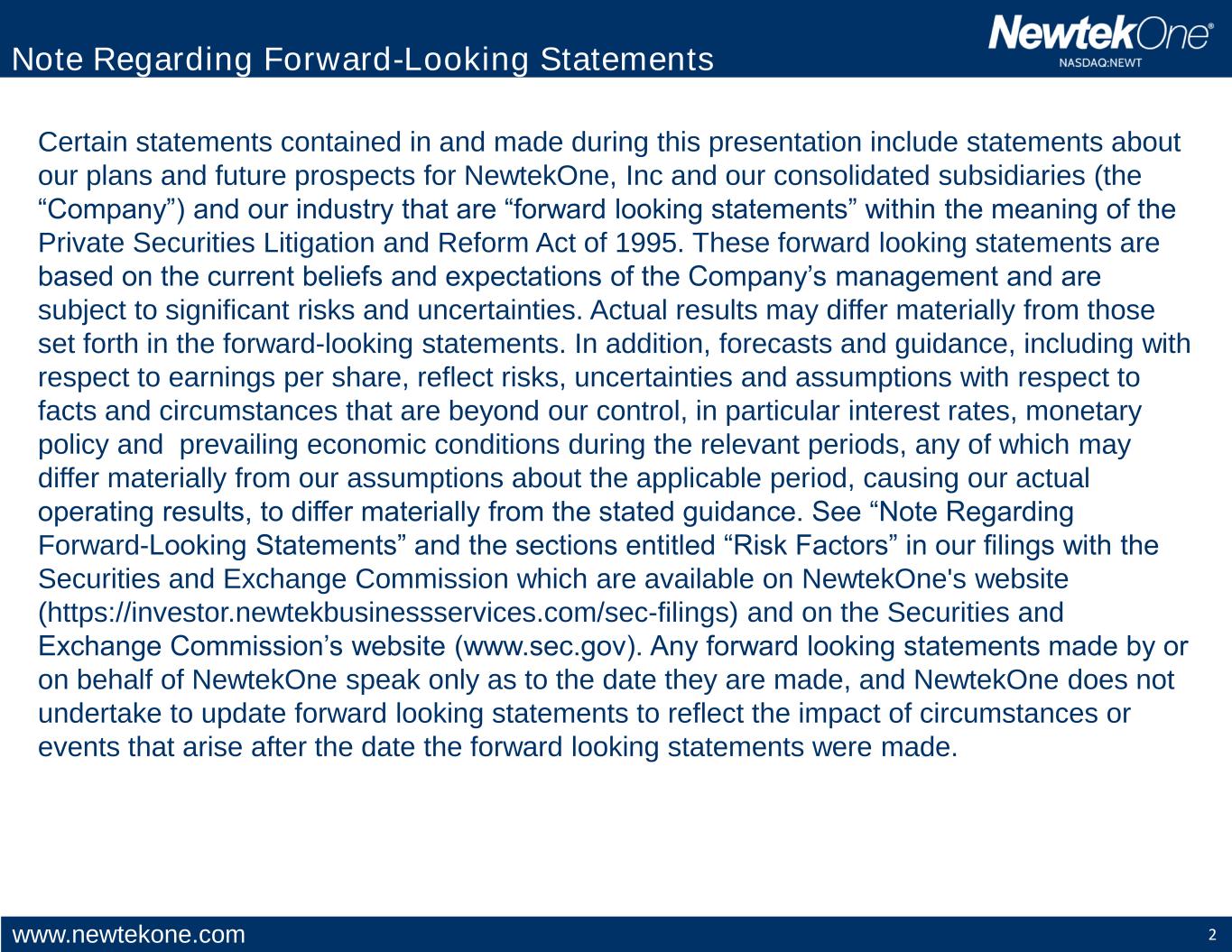 www.newtekone.com 2 Note Regarding Forward-Looking Statements Certain statements contained in and made during this presentation include statements about our plans and future prospects for NewtekOne, Inc and our consolidated subsidiaries (the “Company”) and our industry that are “forward looking statements” within the meaning of the Private Securities Litigation and Reform Act of 1995. These forward looking statements are based on the current beliefs and expectations of the Company’s management and are subject to significant risks and uncertainties. Actual results may differ materially from those set forth in the forward-looking statements. In addition, forecasts and guidance, including with respect to earnings per share, reflect risks, uncertainties and assumptions with respect to facts and circumstances that are beyond our control, in particular interest rates, monetary policy and prevailing economic conditions during the relevant periods, any of which may differ materially from our assumptions about the applicable period, causing our actual operating results, to differ materially from the stated guidance. See “Note Regarding Forward-Looking Statements” and the sections entitled “Risk Factors” in our filings with the Securities and Exchange Commission which are available on NewtekOne's website (https://investor.newtekbusinessservices.com/sec-filings) and on the Securities and Exchange Commission’s website (www.sec.gov). Any forward looking statements made by or on behalf of NewtekOne speak only as to the date they are made, and NewtekOne does not undertake to update forward looking statements to reflect the impact of circumstances or events that arise after the date the forward looking statements were made.