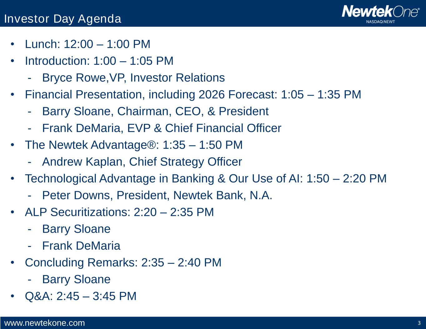 www.newtekone.com 3 • Lunch: 12:00 – 1:00 PM • Introduction: 1:00 – 1:05 PM - Bryce Rowe,VP, Investor Relations • Financial Presentation, including 2026 Forecast: 1:05 – 1:35 PM - Barry Sloane, Chairman, CEO, & President - Frank DeMaria, EVP & Chief Financial Officer • The Newtek Advantage®: 1:35 – 1:50 PM - Andrew Kaplan, Chief Strategy Officer • Technological Advantage in Banking & Our Use of AI: 1:50 – 2:20 PM - Peter Downs, President, Newtek Bank, N.A. • ALP Securitizations: 2:20 – 2:35 PM - Barry Sloane - Frank DeMaria • Concluding Remarks: 2:35 – 2:40 PM - Barry Sloane • Q&A: 2:45 – 3:45 PM Investor Day Agenda