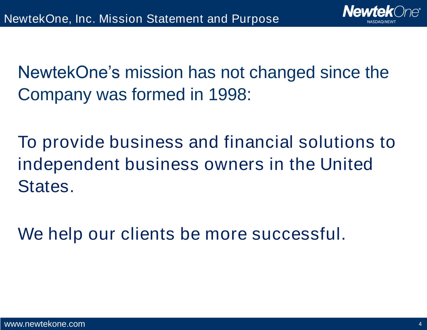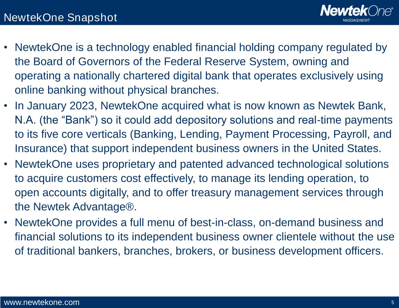 www.newtekone.com 4 NewtekOne’s mission has not changed since the Company was formed in 1998: To provide business and financial solutions to independent business owners in the United States. We help our clients be more successful. NewtekOne, Inc. Mission Statement and Purpose