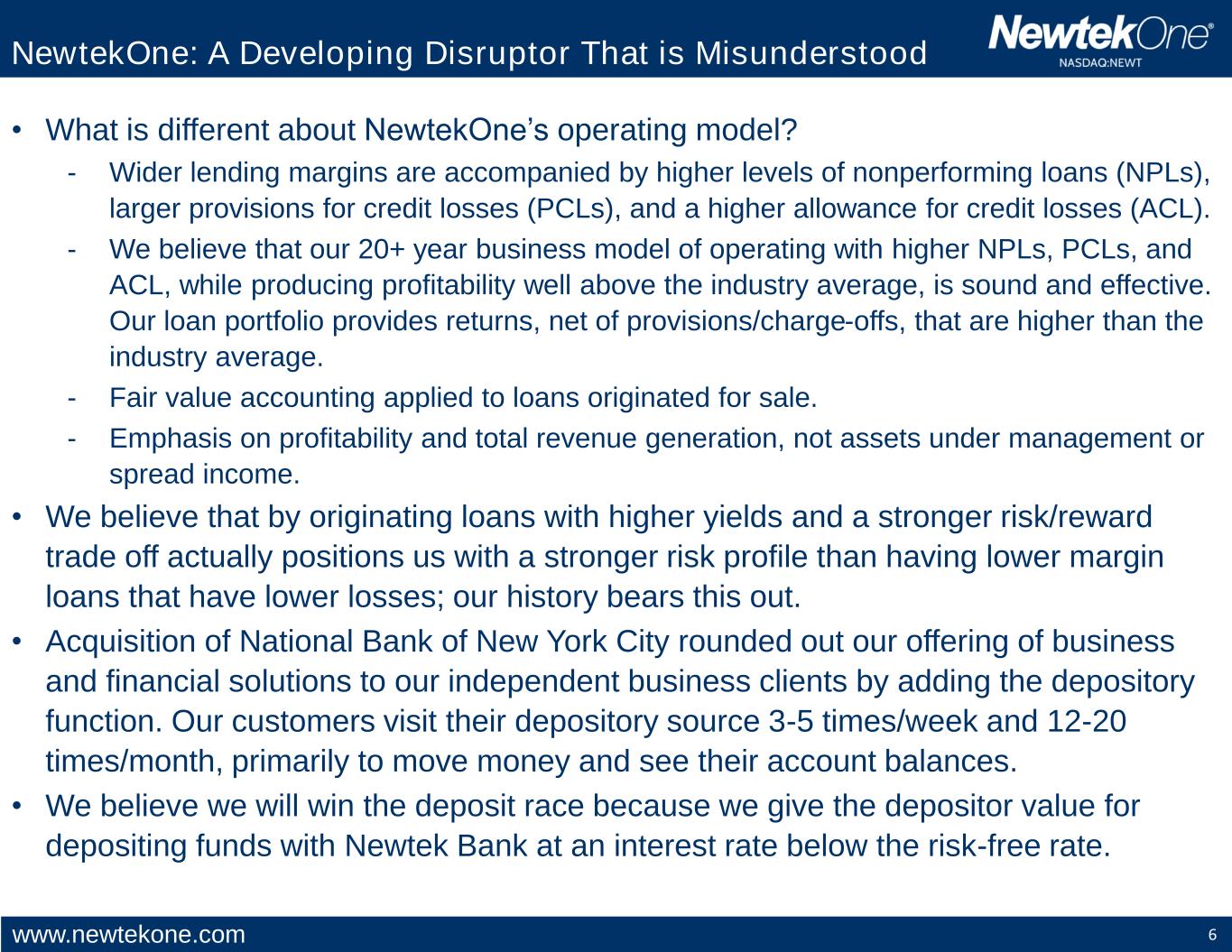 www.newtekone.com 6 • What is different about NewtekOne’s operating model? - Wider lending margins are accompanied by higher levels of nonperforming loans (NPLs), larger provisions for credit losses (PCLs), and a higher allowance for credit losses (ACL). - We believe that our 20+ year business model of operating with higher NPLs, PCLs, and ACL, while producing profitability well above the industry average, is sound and effective. Our loan portfolio provides returns, net of provisions/charge-offs, that are higher than the industry average. - Fair value accounting applied to loans originated for sale. - Emphasis on profitability and total revenue generation, not assets under management or spread income. • We believe that by originating loans with higher yields and a stronger risk/reward trade off actually positions us with a stronger risk profile than having lower margin loans that have lower losses; our history bears this out. • Acquisition of National Bank of New York City rounded out our offering of business and financial solutions to our independent business clients by adding the depository function. Our customers visit their depository source 3-5 times/week and 12-20 times/month, primarily to move money and see their account balances. • We believe we will win the deposit race because we give the depositor value for depositing funds with Newtek Bank at an interest rate below the risk-free rate. NewtekOne: A Developing Disruptor That is Misunderstood