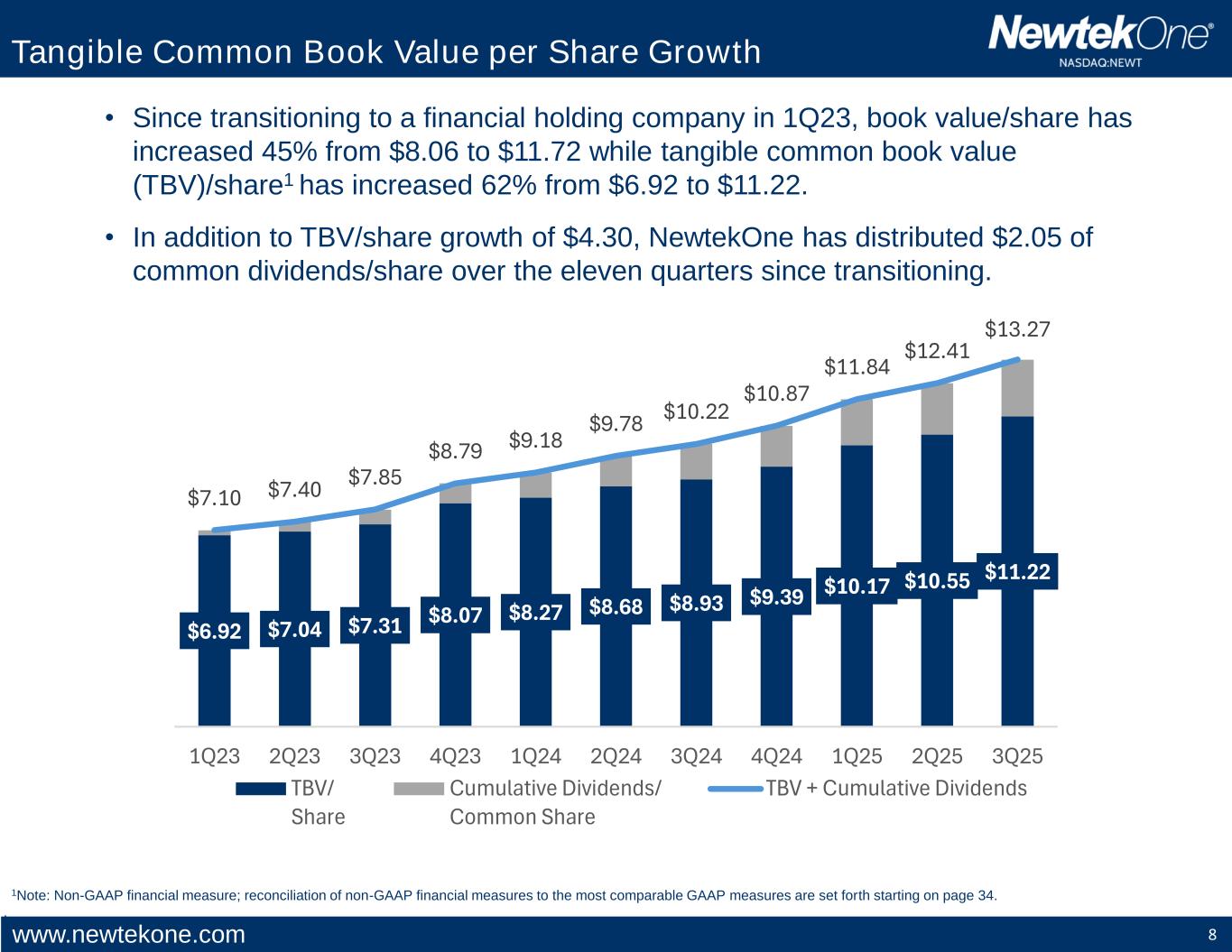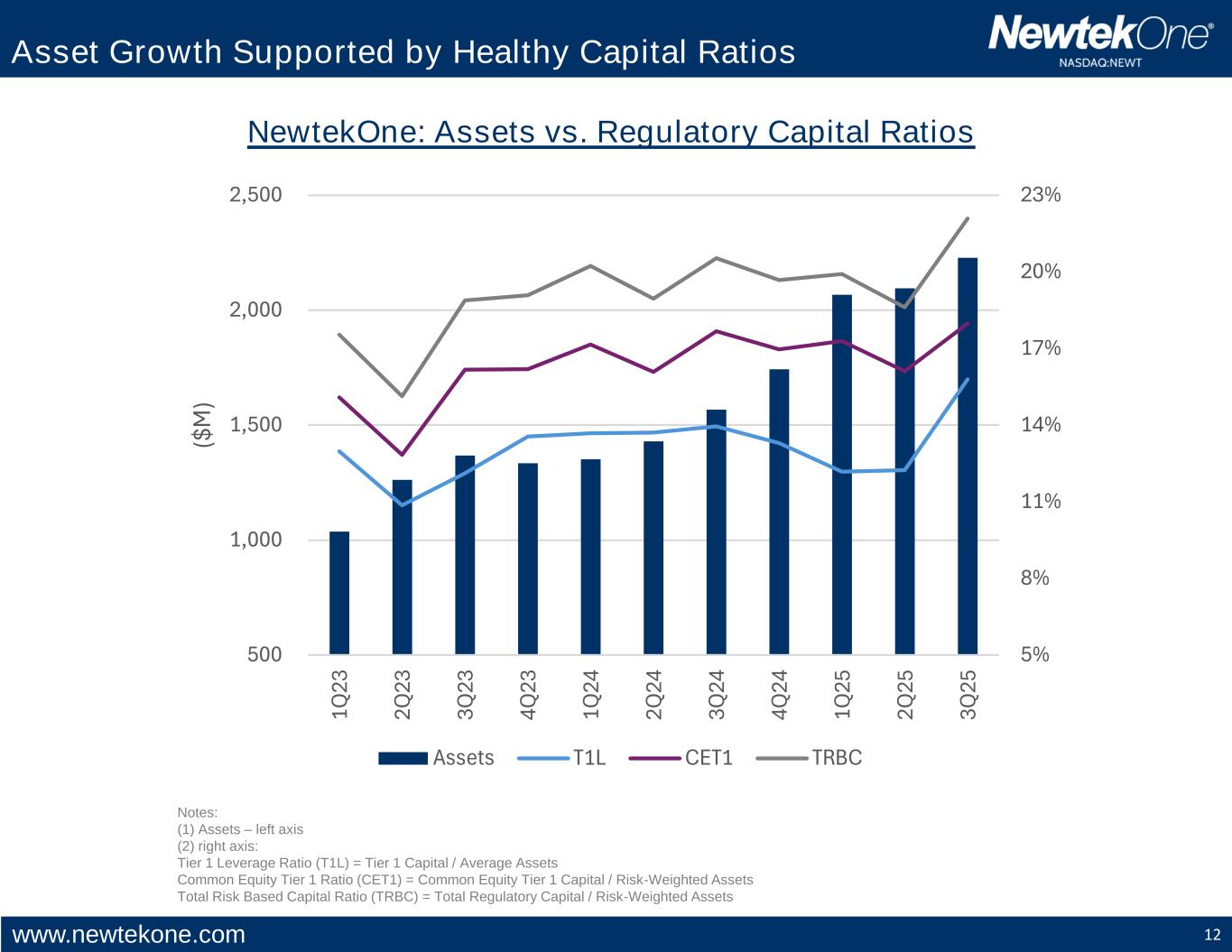 www.newtekone.com 11 11.8% 14.2% 23.1% 25.4% 15.6% 20.3% 20.4% 31.0% 13.8% 19.6% 24.0% 5.0% 10.0% 15.0% 20.0% 25.0% 30.0% 35.0% 1Q* 2Q 3Q 4Q 1.8% 2.1% 3.0% 3.2% 2.8% 2.8% 2.9% 4.1% 1.8% 2.6% 3.1% 1.00% 1.50% 2.00% 2.50% 3.00% 3.50% 4.00% 4.50% 1Q* 2Q 3Q 4Q 10.1% 12.0% 18.8% 20.2% 13.5% 17.0% 17.3% 26.0% 12.7% 17.9% 20.9% 5.0% 10.0% 15.0% 20.0% 25.0% 30.0% 1Q* 2Q 3Q 4Q Consistently Strong Profitability 2023 2024 2025 NewtekOne Return on Avg. Assets1 NewtekOne Return on Avg. Common Tangible Equity1 NewtekOne Return on Avg. Equity1 1Note: Non-GAAP financial measure; reconciliation of non-GAAP financial measures to the most comparable GAAP measures are set forth starting on page 34. . * 1Q23 profitability in three charts is normalized for a 26% tax rate. .