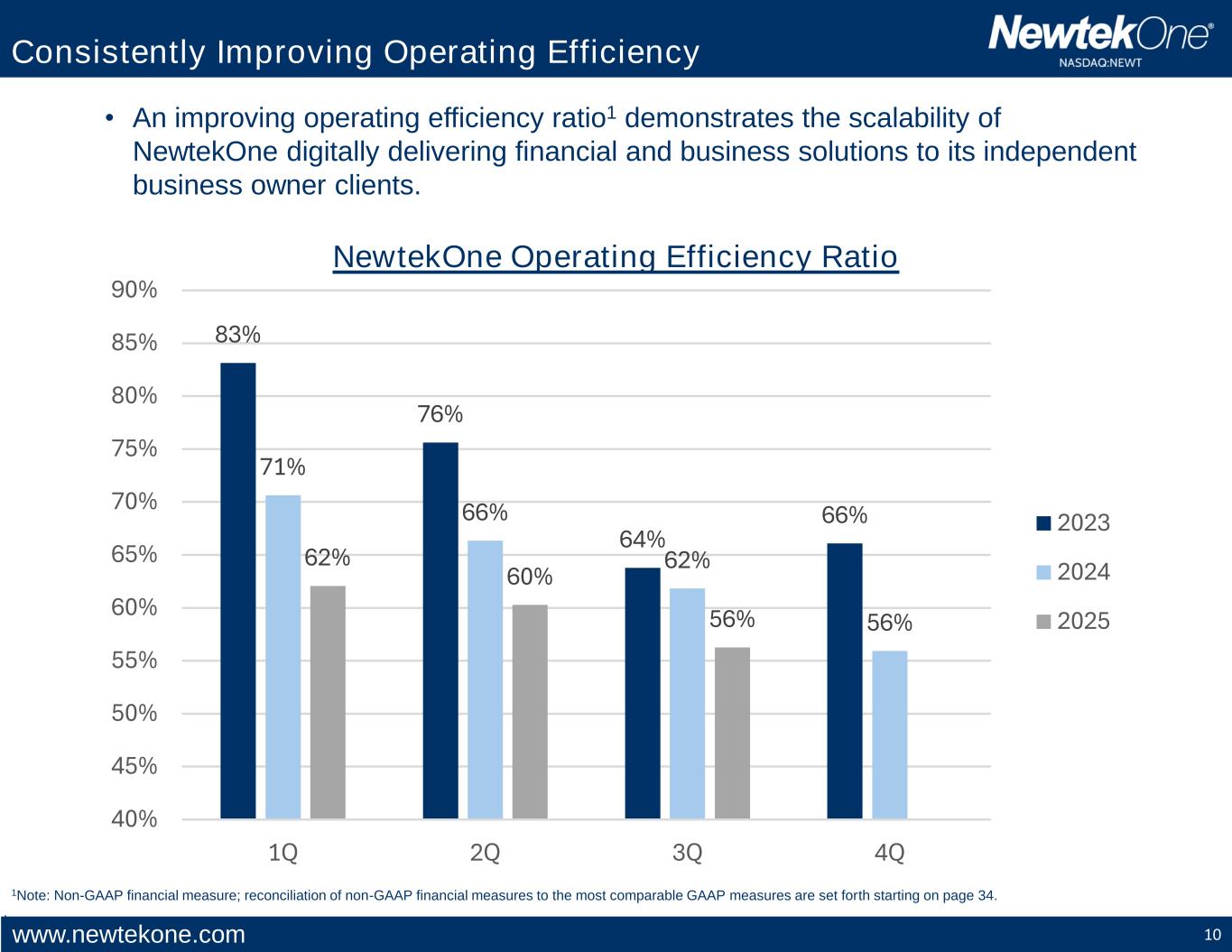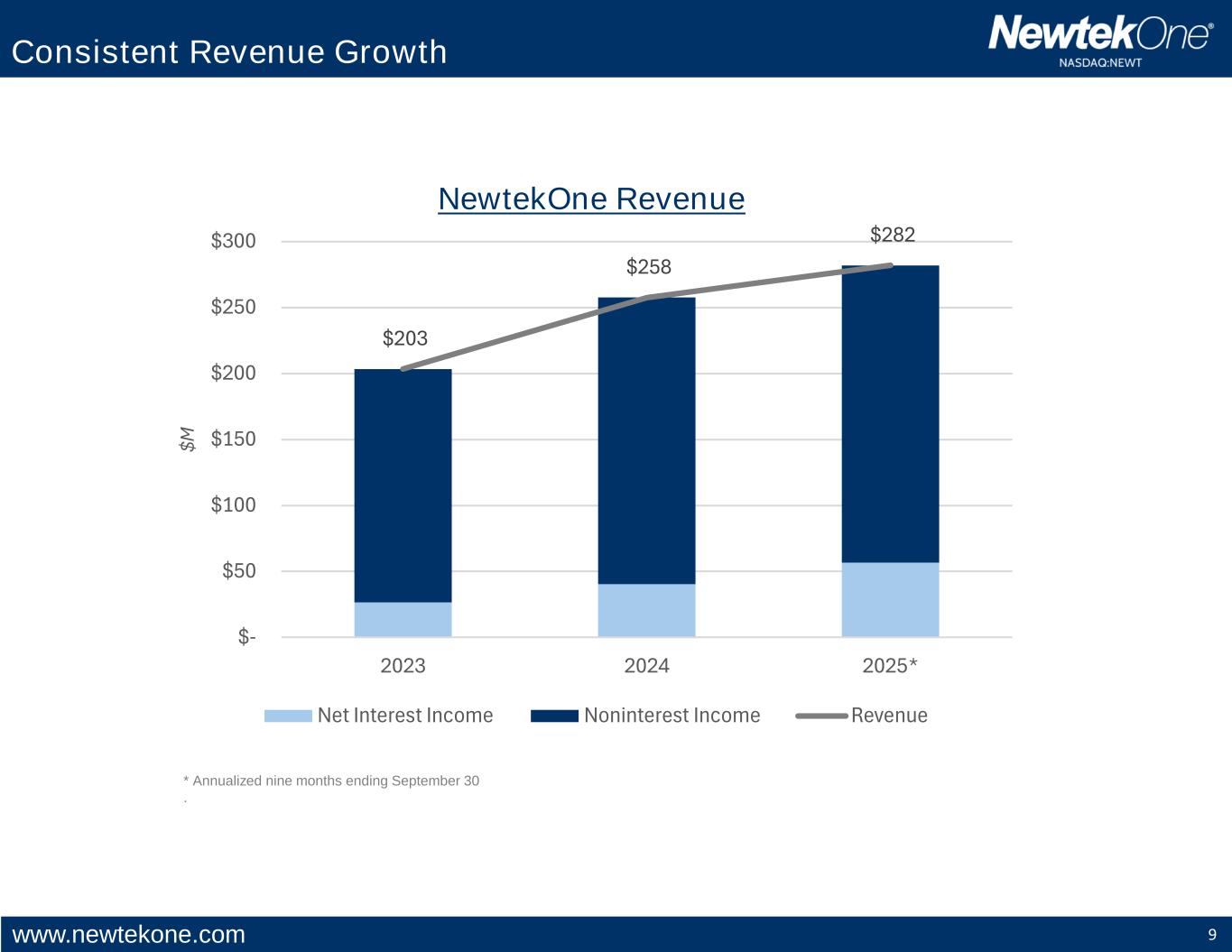 www.newtekone.com 9 Consistent Revenue Growth NewtekOne Revenue * Annualized nine months ending September 30 . $203 $258 $282 $- $50 $100 $150 $200 $250 $300 2023 2024 2025* $M Net Interest Income Noninterest Income Revenue