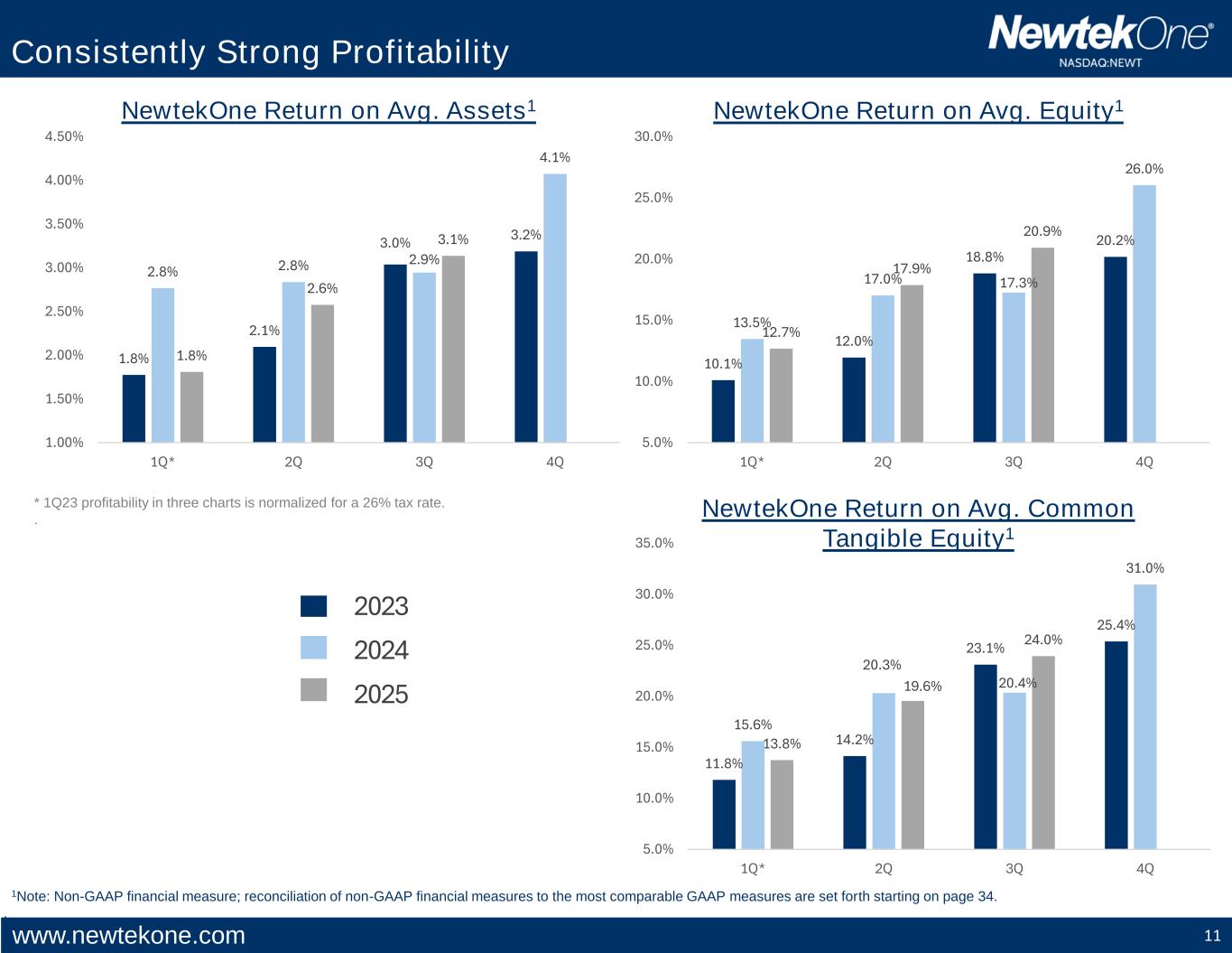 www.newtekone.com 10 Consistently Improving Operating Efficiency 83% 76% 64% 66% 71% 66% 62% 56% 62% 60% 56% 40% 45% 50% 55% 60% 65% 70% 75% 80% 85% 90% 1Q 2Q 3Q 4Q 2023 2024 2025 NewtekOne Operating Efficiency Ratio • An improving operating efficiency ratio1 demonstrates the scalability of NewtekOne digitally delivering financial and business solutions to its independent business owner clients. 1Note: Non-GAAP financial measure; reconciliation of non-GAAP financial measures to the most comparable GAAP measures are set forth starting on page 34. .
