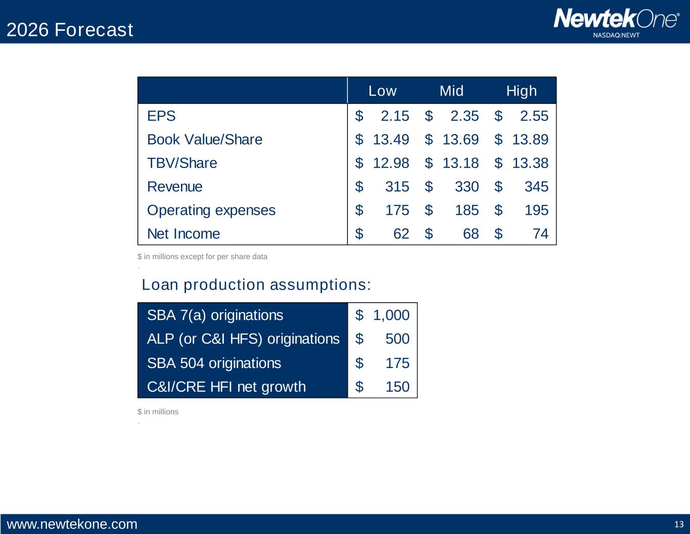 www.newtekone.com 13 2026 Forecast Loan production assumptions: $ in millions except for per share data . SBA 7(a) originations 1,000$ ALP (or C&I HFS) originations 500$ SBA 504 originations 175$ C&I/CRE HFI net growth 150$ $ in millions . Low Mid High EPS 2.15$ 2.35$ 2.55$ Book Value/Share 13.49$ 13.69$ 13.89$ TBV/Share 12.98$ 13.18$ 13.38$ Revenue 315$ 330$ 345$ Operating expenses 175$ 185$ 195$ Net Income 62$ 68$ 74$