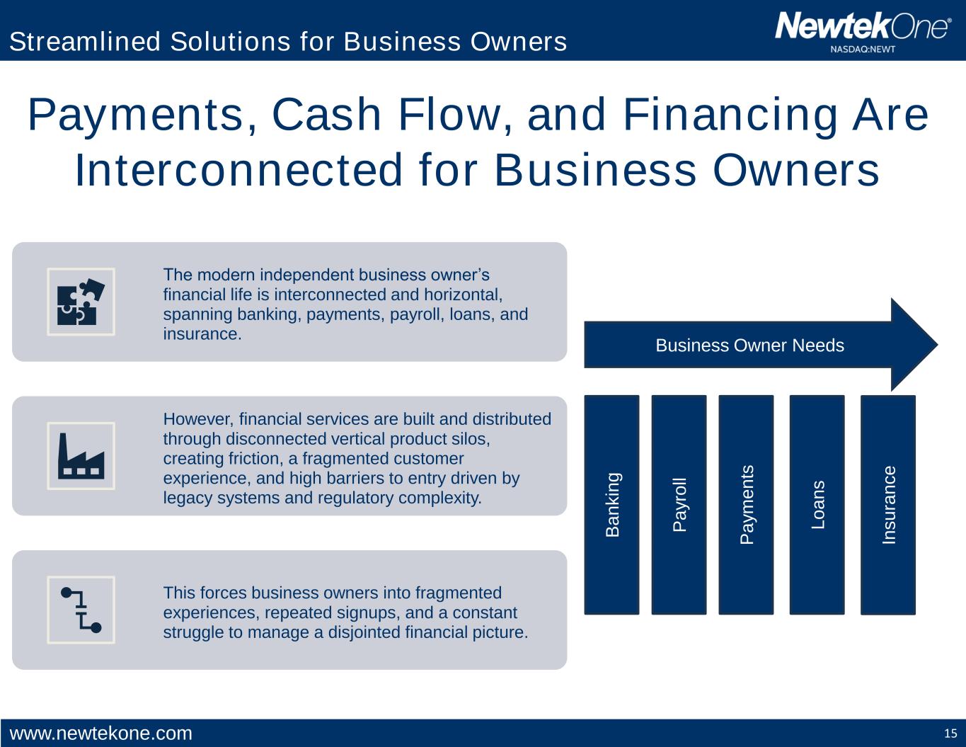 www.newtekone.com 15 Payments, Cash Flow, and Financing Are Interconnected for Business Owners Business Owner Needs B a n k in g P a y ro ll P a y m e n ts L o a n s In s u ra n c e The modern independent business owner’s financial life is interconnected and horizontal, spanning banking, payments, payroll, loans, and insurance. However, financial services are built and distributed through disconnected vertical product silos, creating friction, a fragmented customer experience, and high barriers to entry driven by legacy systems and regulatory complexity. This forces business owners into fragmented experiences, repeated signups, and a constant struggle to manage a disjointed financial picture. Streamlined Solutions for Business Owners