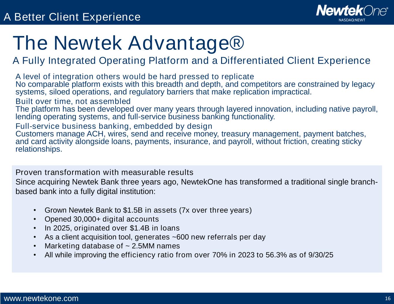 www.newtekone.com 16 The Newtek Advantage® A Fully Integrated Operating Platform and a Differentiated Client Experience A level of integration others would be hard pressed to replicate No comparable platform exists with this breadth and depth, and competitors are constrained by legacy systems, siloed operations, and regulatory barriers that make replication impractical. Built over time, not assembled The platform has been developed over many years through layered innovation, including native payroll, lending operating systems, and full-service business banking functionality. Full-service business banking, embedded by design Customers manage ACH, wires, send and receive money, treasury management, payment batches, and card activity alongside loans, payments, insurance, and payroll, without friction, creating sticky relationships. Proven transformation with measurable results Since acquiring Newtek Bank three years ago, NewtekOne has transformed a traditional single branch- based bank into a fully digital institution: • Grown Newtek Bank to $1.5B in assets (7x over three years) • Opened 30,000+ digital accounts • In 2025, originated over $1.4B in loans • As a client acquisition tool, generates ~600 new referrals per day • Marketing database of ~ 2.5MM names • All while improving the efficiency ratio from over 70% in 2023 to 56.3% as of 9/30/25 A Better Client Experience