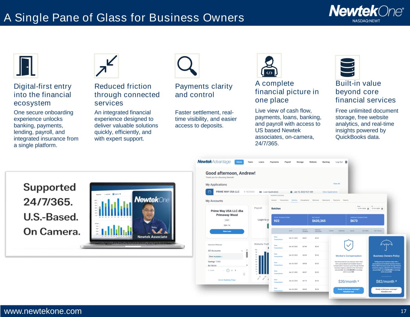 www.newtekone.com 17 Digital-first entry into the financial ecosystem One secure onboarding experience unlocks banking, payments, lending, payroll, and integrated insurance from a single platform. Reduced friction through connected services An integrated financial experience designed to deliver valuable solutions quickly, efficiently, and with expert support. Payments clarity and control Faster settlement, real- time visibility, and easier access to deposits. Built-in value beyond core financial services Free unlimited document storage, free website analytics, and real-time insights powered by QuickBooks data. A complete financial picture in one place Live view of cash flow, payments, loans, banking, and payroll with access to US based Newtek associates, on-camera, 24/7/365. A Single Pane of Glass for Business Owners