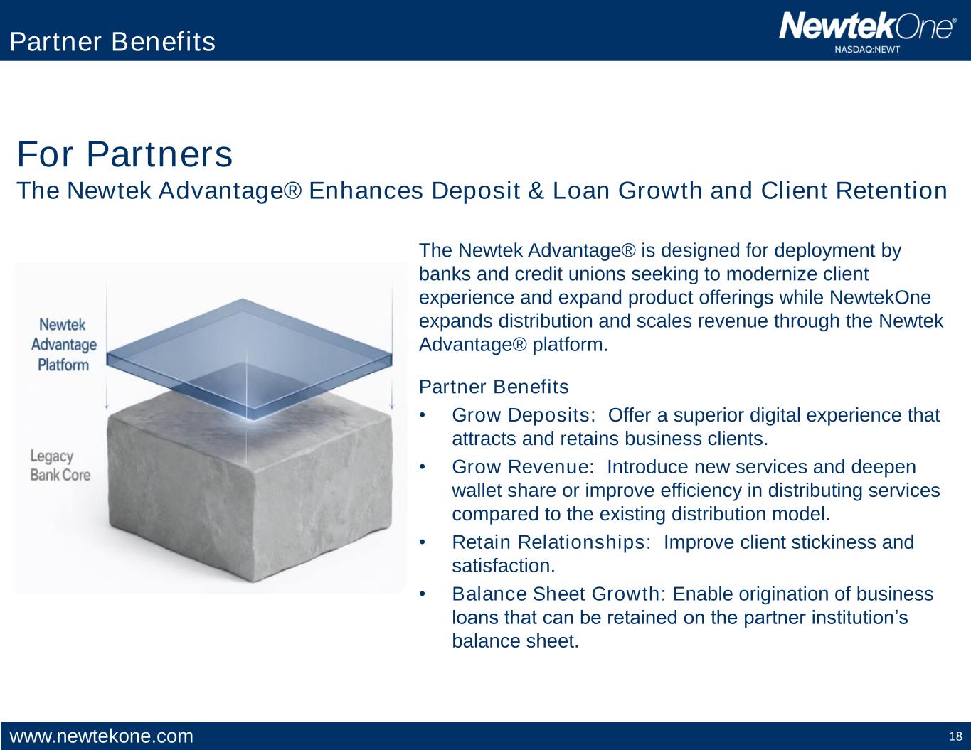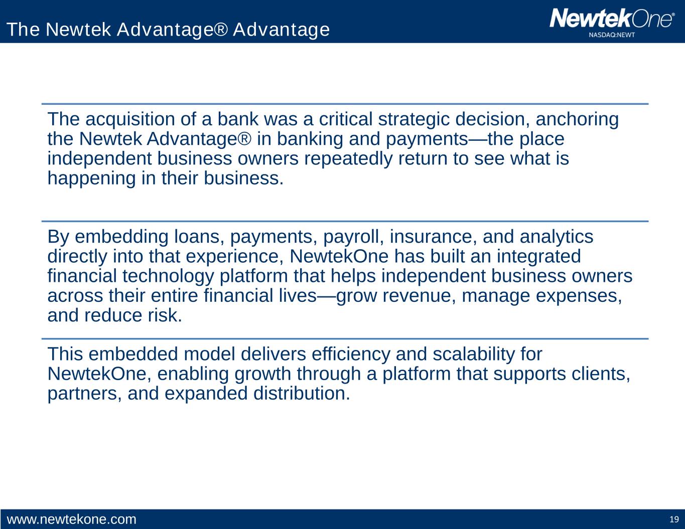 www.newtekone.com 18 For Partners The Newtek Advantage® Enhances Deposit & Loan Growth and Client Retention The Newtek Advantage® is designed for deployment by banks and credit unions seeking to modernize client experience and expand product offerings while NewtekOne expands distribution and scales revenue through the Newtek Advantage® platform. Partner Benefits • Grow Deposits: Offer a superior digital experience that attracts and retains business clients. • Grow Revenue: Introduce new services and deepen wallet share or improve efficiency in distributing services compared to the existing distribution model. • Retain Relationships: Improve client stickiness and satisfaction. • Balance Sheet Growth: Enable origination of business loans that can be retained on the partner institution’s balance sheet. Partner Benefits
