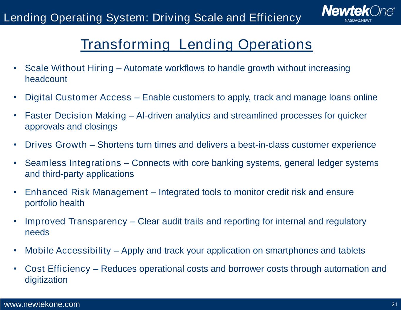 www.newtekone.com 21 Lending Operating System: Driving Scale and Efficiency Transforming Lending Operations • Scale Without Hiring – Automate workflows to handle growth without increasing headcount • Digital Customer Access – Enable customers to apply, track and manage loans online • Faster Decision Making – AI-driven analytics and streamlined processes for quicker approvals and closings • Drives Growth – Shortens turn times and delivers a best-in-class customer experience • Seamless Integrations – Connects with core banking systems, general ledger systems and third-party applications • Enhanced Risk Management – Integrated tools to monitor credit risk and ensure portfolio health • Improved Transparency – Clear audit trails and reporting for internal and regulatory needs • Mobile Accessibility – Apply and track your application on smartphones and tablets • Cost Efficiency – Reduces operational costs and borrower costs through automation and digitization