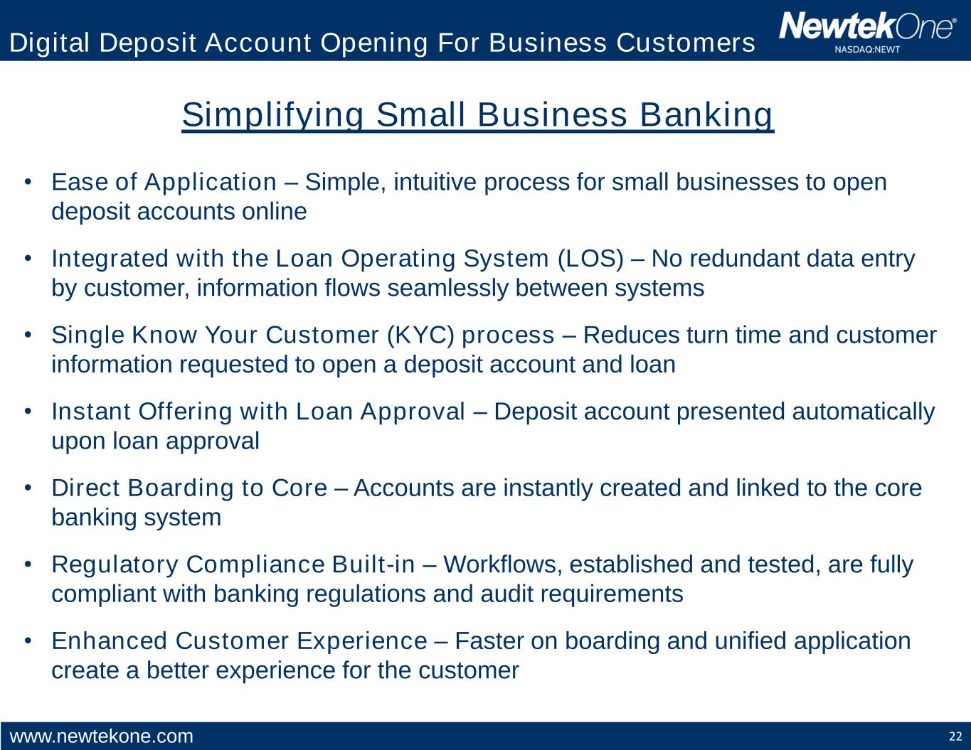 www.newtekone.com 22 Digital Deposit Account Opening For Business Customers Simplifying Small Business Banking • Ease of Application – Simple, intuitive process for small businesses to open deposit accounts online • Integrated with the Loan Operating System (LOS) – No redundant data entry by customer, information flows seamlessly between systems • Single Know Your Customer (KYC) process – Reduces turn time and customer information requested to open a deposit account and loan • Instant Offering with Loan Approval – Deposit account presented automatically upon loan approval • Direct Boarding to Core – Accounts are instantly created and linked to the core banking system • Regulatory Compliance Built-in – Workflows, established and tested, are fully compliant with banking regulations and audit requirements • Enhanced Customer Experience – Faster on boarding and unified application create a better experience for the customer