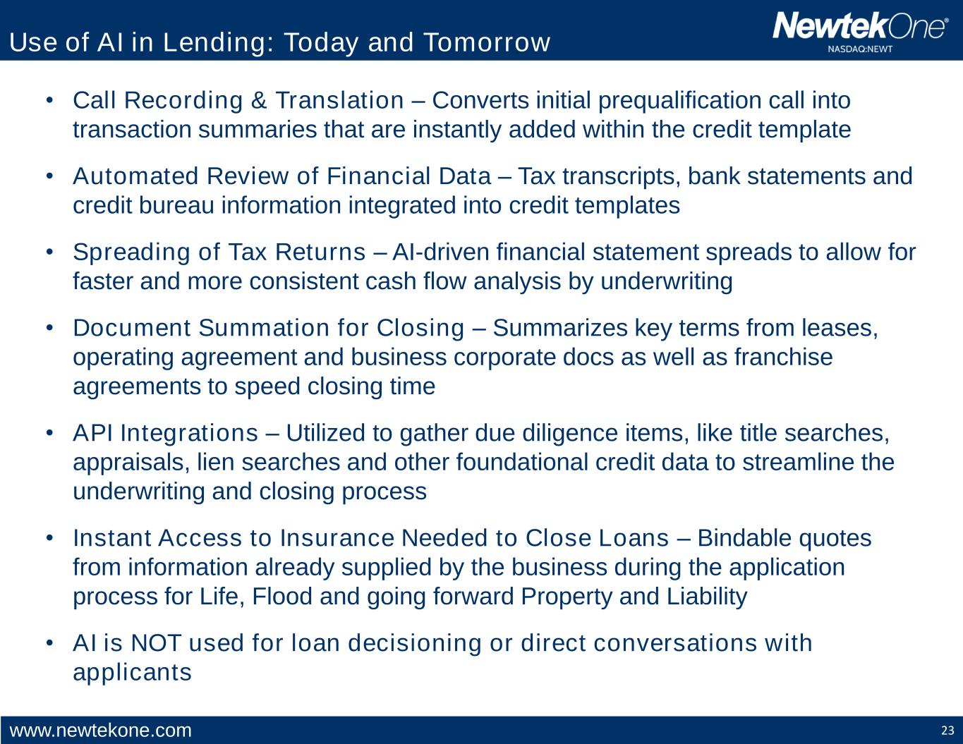 www.newtekone.com 23 Use of AI in Lending: Today and Tomorrow • Call Recording & Translation – Converts initial prequalification call into transaction summaries that are instantly added within the credit template • Automated Review of Financial Data – Tax transcripts, bank statements and credit bureau information integrated into credit templates • Spreading of Tax Returns – AI-driven financial statement spreads to allow for faster and more consistent cash flow analysis by underwriting • Document Summation for Closing – Summarizes key terms from leases, operating agreement and business corporate docs as well as franchise agreements to speed closing time • API Integrations – Utilized to gather due diligence items, like title searches, appraisals, lien searches and other foundational credit data to streamline the underwriting and closing process • Instant Access to Insurance Needed to Close Loans – Bindable quotes from information already supplied by the business during the application process for Life, Flood and going forward Property and Liability • AI is NOT used for loan decisioning or direct conversations with applicants