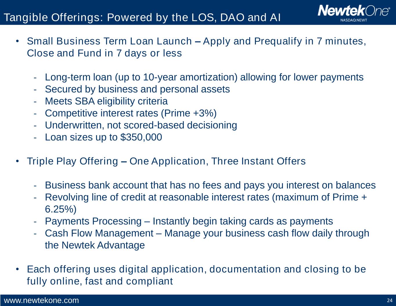 www.newtekone.com 24 Tangible Offerings: Powered by the LOS, DAO and AI • Small Business Term Loan Launch – Apply and Prequalify in 7 minutes, Close and Fund in 7 days or less - Long-term loan (up to 10-year amortization) allowing for lower payments - Secured by business and personal assets - Meets SBA eligibility criteria - Competitive interest rates (Prime +3%) - Underwritten, not scored-based decisioning - Loan sizes up to $350,000 • Triple Play Offering – One Application, Three Instant Offers - Business bank account that has no fees and pays you interest on balances - Revolving line of credit at reasonable interest rates (maximum of Prime + 6.25%) - Payments Processing – Instantly begin taking cards as payments - Cash Flow Management – Manage your business cash flow daily through the Newtek Advantage • Each offering uses digital application, documentation and closing to be fully online, fast and compliant