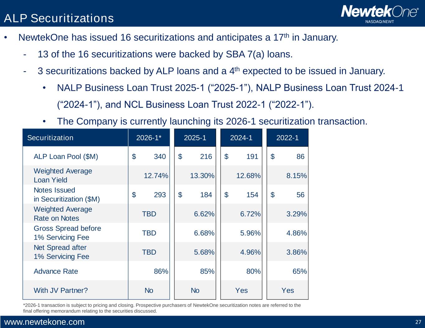 www.newtekone.com 27 • NewtekOne has issued 16 securitizations and anticipates a 17th in January. - 13 of the 16 securitizations were backed by SBA 7(a) loans. - 3 securitizations backed by ALP loans and a 4th expected to be issued in January. • NALP Business Loan Trust 2025-1 (“2025-1”), NALP Business Loan Trust 2024-1 (“2024-1”), and NCL Business Loan Trust 2022-1 (“2022-1”). • The Company is currently launching its 2026-1 securitization transaction. ALP Securitizations *2026-1 transaction is subject to pricing and closing. Prospective purchasers of NewtekOne securitization notes are referred to the final offering memorandum relating to the securities discussed. Securitization 2026-1* 2025-1 2024-1 2022-1 ALP Loan Pool ($M) 340$ 216$ 191$ 86$ Weighted Average Loan Yield 12.74% 13.30% 12.68% 8.15% Notes Issued in Securitization ($M) 293$ 184$ 154$ 56$ Weighted Average Rate on Notes TBD 6.62% 6.72% 3.29% Gross Spread before 1% Servicing Fee TBD 6.68% 5.96% 4.86% Net Spread after 1% Servicing Fee TBD 5.68% 4.96% 3.86% Advance Rate 86% 85% 80% 65% With JV Partner? No No Yes Yes