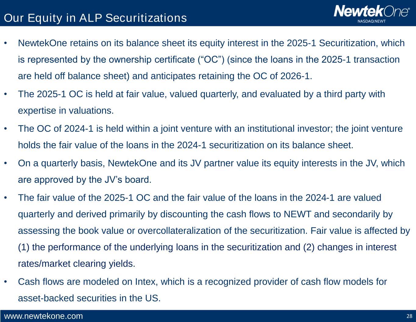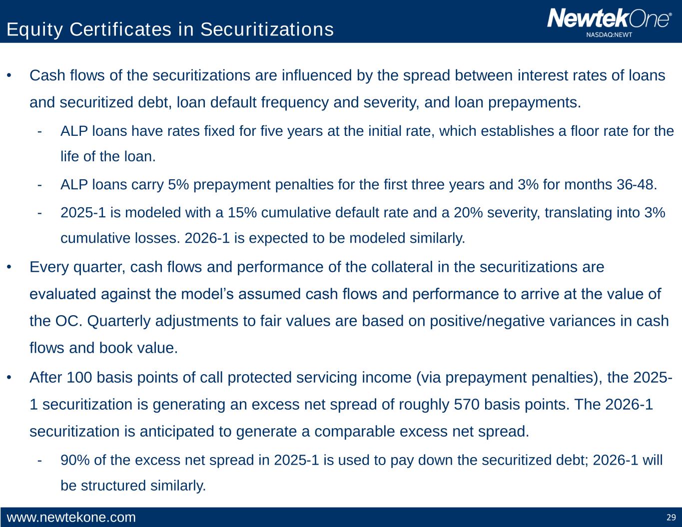 www.newtekone.com 28 • NewtekOne retains on its balance sheet its equity interest in the 2025-1 Securitization, which is represented by the ownership certificate (“OC”) (since the loans in the 2025-1 transaction are held off balance sheet) and anticipates retaining the OC of 2026-1. • The 2025-1 OC is held at fair value, valued quarterly, and evaluated by a third party with expertise in valuations. • The OC of 2024-1 is held within a joint venture with an institutional investor; the joint venture holds the fair value of the loans in the 2024-1 securitization on its balance sheet. • On a quarterly basis, NewtekOne and its JV partner value its equity interests in the JV, which are approved by the JV’s board. • The fair value of the 2025-1 OC and the fair value of the loans in the 2024-1 are valued quarterly and derived primarily by discounting the cash flows to NEWT and secondarily by assessing the book value or overcollateralization of the securitization. Fair value is affected by (1) the performance of the underlying loans in the securitization and (2) changes in interest rates/market clearing yields. • Cash flows are modeled on Intex, which is a recognized provider of cash flow models for asset-backed securities in the US. Our Equity in ALP Securitizations