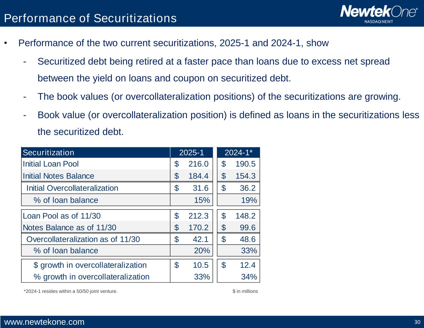 www.newtekone.com 30 • Performance of the two current securitizations, 2025-1 and 2024-1, show - Securitized debt being retired at a faster pace than loans due to excess net spread between the yield on loans and coupon on securitized debt. - The book values (or overcollateralization positions) of the securitizations are growing. - Book value (or overcollateralization position) is defined as loans in the securitizations less the securitized debt. Performance of Securitizations *2024-1 resides within a 50/50 joint venture. $ in millions Securitization 2025-1 2024-1* Initial Loan Pool 216.0$ 190.5$ Initial Notes Balance 184.4$ 154.3$ Initial Overcollateralization 31.6$ 36.2$ % of loan balance 15% 19% Loan Pool as of 11/30 212.3$ 148.2$ Notes Balance as of 11/30 170.2$ 99.6$ Overcollateralization as of 11/30 42.1$ 48.6$ % of loan balance 20% 33% $ growth in overcollateralization 10.5$ 12.4$ % growth in overcollateralization 33% 34%
