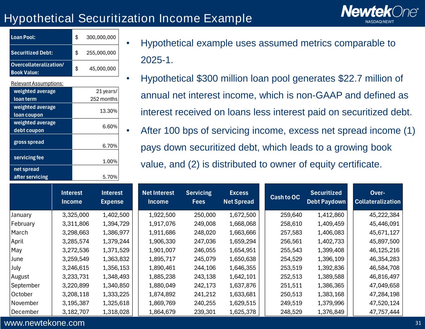 www.newtekone.com 31 Hypothetical Securitization Income Example Interest Income Interest Expense Net Interest Income Servicing Fees Excess Net Spread Cash to OC Securitized Debt Paydown Over- Collateralization January 3,325,000 1,402,500 1,922,500 250,000 1,672,500 259,640 1,412,860 45,222,384 February 3,311,806 1,394,729 1,917,076 249,008 1,668,068 258,610 1,409,459 45,446,091 March 3,298,663 1,386,977 1,911,686 248,020 1,663,666 257,583 1,406,083 45,671,127 April 3,285,574 1,379,244 1,906,330 247,036 1,659,294 256,561 1,402,733 45,897,500 May 3,272,536 1,371,529 1,901,007 246,055 1,654,951 255,543 1,399,408 46,125,216 June 3,259,549 1,363,832 1,895,717 245,079 1,650,638 254,529 1,396,109 46,354,283 July 3,246,615 1,356,153 1,890,461 244,106 1,646,355 253,519 1,392,836 46,584,708 August 3,233,731 1,348,493 1,885,238 243,138 1,642,101 252,513 1,389,588 46,816,497 September 3,220,899 1,340,850 1,880,049 242,173 1,637,876 251,511 1,386,365 47,049,658 October 3,208,118 1,333,225 1,874,892 241,212 1,633,681 250,513 1,383,168 47,284,198 November 3,195,387 1,325,618 1,869,769 240,255 1,629,515 249,519 1,379,996 47,520,124 December 3,182,707 1,318,028 1,864,679 239,301 1,625,378 248,529 1,376,849 47,757,444 Loan Pool: 300,000,000$ Securitized Debt: 255,000,000$ Overcollateralization/ Book Value: 45,000,000$ Relevant Assumptions: weighted average loan term 21 years/ 252 months weighted average loan coupon 13.30% weighted average debt coupon 6.60% gross spread 6.70% servicing fee 1.00% net spread after servicing 5.70% • Hypothetical example uses assumed metrics comparable to 2025-1. • Hypothetical $300 million loan pool generates $22.7 million of annual net interest income, which is non-GAAP and defined as interest received on loans less interest paid on securitized debt. • After 100 bps of servicing income, excess net spread income (1) pays down securitized debt, which leads to a growing book value, and (2) is distributed to owner of equity certificate.